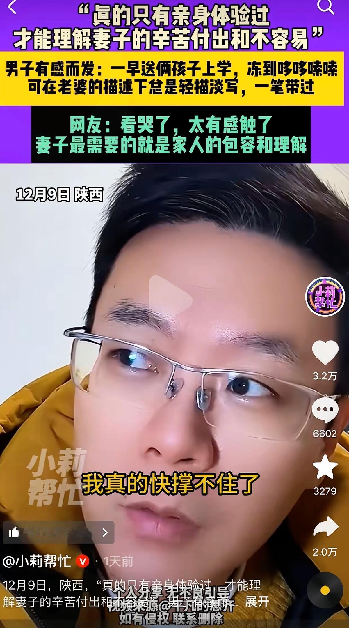 送娃两天冻到崩溃!男人的“偶尔体验”,竟是女人的全年无休! 陕西男子替生病妻子送娃,冻得手僵就感慨妻子不易,这一幕看着暖心却也扎心。 太多男人觉得“带娃做家务”是轻松活,殊不知这是份13小时在岗、全年无休的隐形工作。 妻子们轻描淡写的背后,是无数个早起的清晨、哄睡的深夜,是兼顾三餐和育儿的连轴转。 那些被说成“矫情”的抱怨,不过是想被看见、被体谅的心声。 婚姻里最伤人的,从不是没钱没浪漫,而是你的辛苦被当成理所当然。 真正的夫妻同心,从不是嘴上说心疼,而是主动伸手分担。 你家的家务育儿是怎么分工的?你觉得男人该多久体验一次全职带娃?