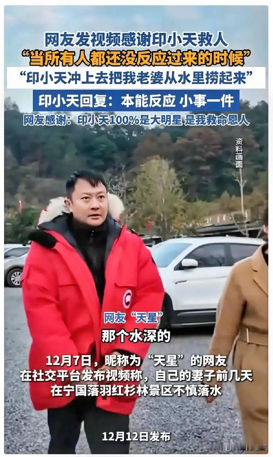 景区10 秒救人的47岁印小天, 最好的回报来了, 不是对方拿出10000感谢费,而是被救者 据悉,当时印小天正在景区游玩,突然发现一名女子掉进水里,马上冲过去救人,印小天不顾自身湿泥,三秒就把人拉上岸。 印小天只说“本能反应,小事一件”,被救者的丈夫不停称赞印小天,说他“身上在发光”。 印小天的行为实在太无私,娱乐圈有这样的人真好! 都说47岁男人最有魅力,一身正气又不摆架子,印小天做到了,值得点赞!