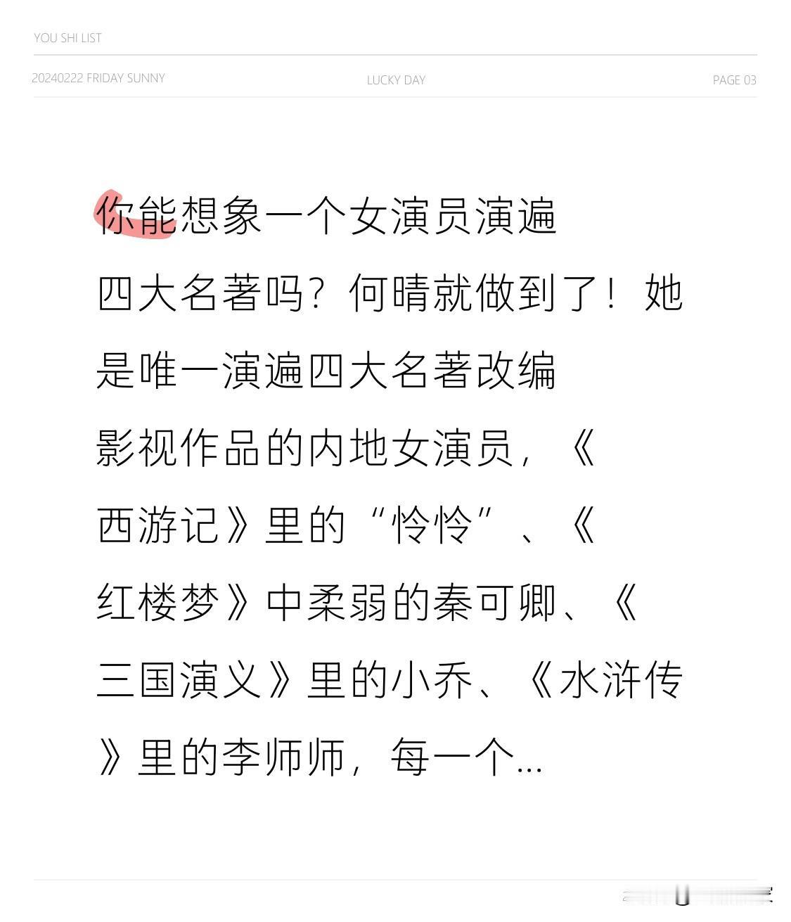 你能想象一个女演员演遍四大名著吗?何晴就做到了!她是唯一演遍四大名著改编影视作品的内地女演员,《西游记》里的“怜怜”、《红楼梦》中柔弱的秦可卿、《三国演义》里的小乔、《水浒传》里的李师师,每一个角色都深入人心。1992年她在《青青河边草》里的现代装也英气勃发。 何晴的离世带走了一个时代的古典美学。她的演艺生涯充满坎坷又无比璀璨,从昆剧团学员到影视经典角色塑造者,她的坚韧令人动容。 你心中何晴最经典的角色是哪个?你觉得她身上哪种特质最能代表古典美学?你希望未来能有更多这样的古典美人出现在荧幕吗? 何赛飞古装 何赛飞承欢记 何晴照片 许诗晴扮演者 何晴古装戏 何心晴 何音古装 赵晴古装照 何晴照片 许诗晴扮演者 何晴古装戏 何心晴 曹晴 何音古装 何婉晴