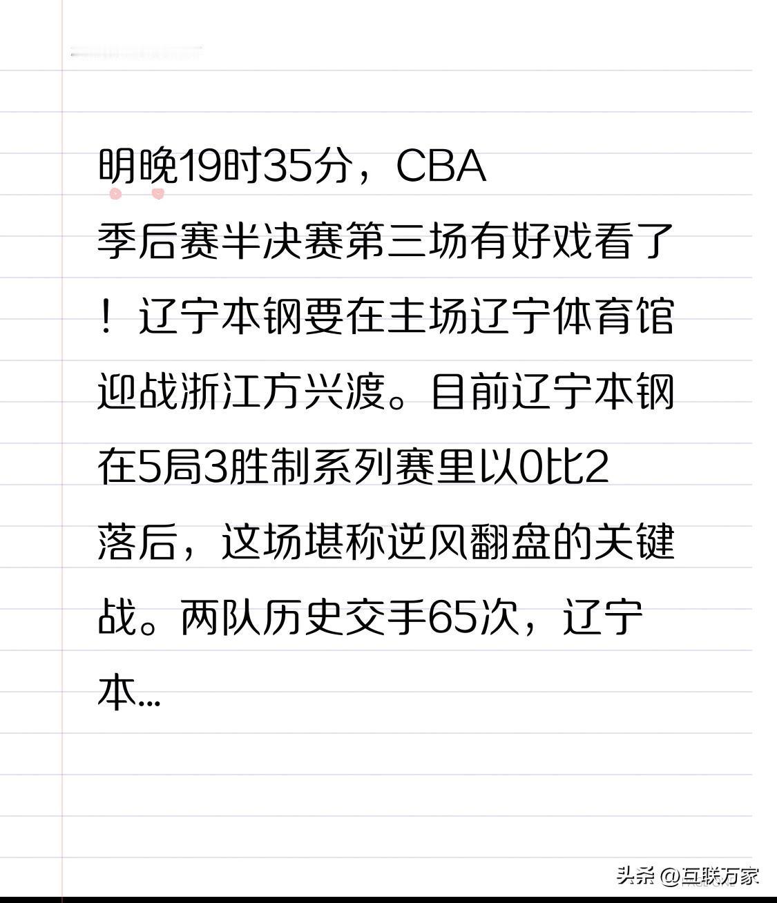 明晚19时35分,CBA季后赛半决赛第三场有好戏看了!辽宁本钢要在主场辽宁体育馆迎战浙江方兴渡。目前辽宁本钢在5局3胜制系列赛里以0比2落后,这场堪称逆风翻盘的关键战。 两队历史交手65次,辽宁本钢36胜29负,但本赛季4次交手全输。辽宁本钢的威尔斯、赵继伟等球员状态如何,能带领球队绝地反击吗?浙江方兴渡又会有怎样的表现? 这一战悬念重重,辽宁本钢能否主场逆袭?大家觉得谁能笑到最后?辽宁队能追平比分吗?这场比赛会出现哪些精彩瞬间? 辽宁男篮 篮球辽宁男篮 辽宁队 CBA辽篮 辽宁男篮队内赛 辽宁新赛季 辽宁男篮u22 辽宁男篮转会期 CBA辽篮 辽宁男篮队内赛 辽宁新赛季 辽宁男篮u22 辽宁男篮转会期 辽宁队警钟长鸣 辽宁四强