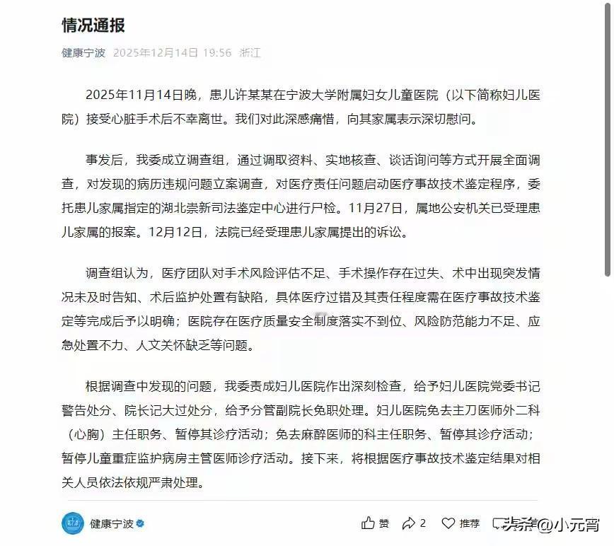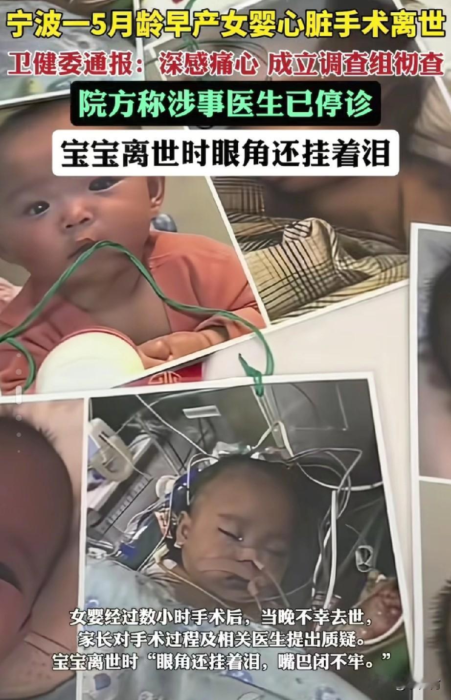 手术室全景监控竟无回放!5月大女婴术后离世,官方通报:主刀停职,院长记大过 5个月大的娃,心脏手术后不幸离世,家属最想看的手术室监控,竟然没有录像? 这事发生在11月14日,宁波一位妈妈把5个月大的女儿送进手术室。术前医生说好3小时,结果孩子在手术台躺了9个小时,出来时眼角还挂着泪,人已经不行了。 卫健委昨天(12月14日)发了通报,我连夜扒完,这细节真是让人后背发凉: 监控“摆烂”:手术间那个看着全场的摄像头,没装硬盘,不具备回放功能!只有麻醉车那个监控能看。这就好比家里装监控,客厅没录上,只有角落里录了,这理由你信吗? 全军覆没:这次罚得真不轻。院长记大过,书记警告,副院长直接免职。主刀医生、麻醉主任、ICU主管,统统停职接受调查。 操作失误:官方盖章了,手术操作有过失,风险评估不足,出了事也没及时告诉家属。 这哪是看病,简直是拿命在赌。虽然主刀医生是30年老资历,但这资历是用病人的命填出来的吗? 目前尸检是在家属指定的湖北机构做的,公安也立案了。希望这次,能给家属一个明明白白的真相。 对此,你怎么看?手术室监控该不该强制录像? 欢迎在评论区聊聊。