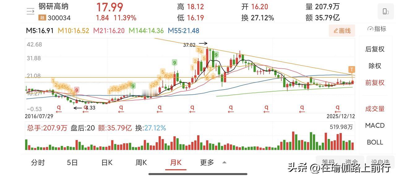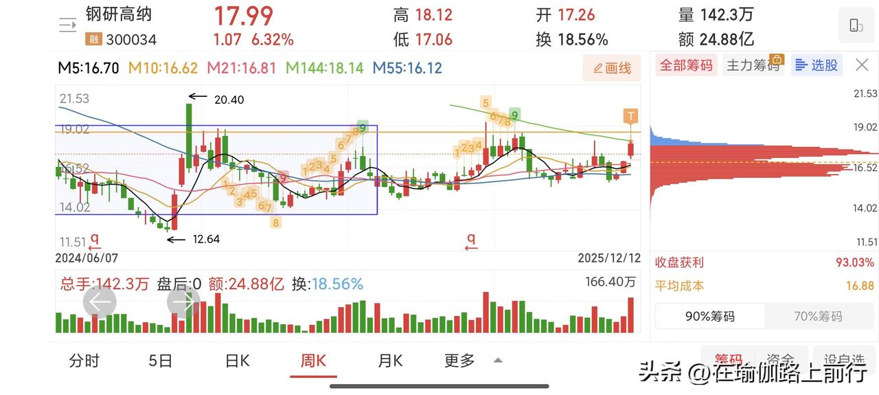 复盘钢研高N(不推票不荐票) 图一季线,低位量比高位量大,且回踩55月线。 图二月线,在低位的三拨下跌中,缩量基本符合主力控盘。 图三周线,均线多头。 图四日线,向上跳空缺口,补缺口就止损。 图五周线,筹码集中,大部分人已赚钱。