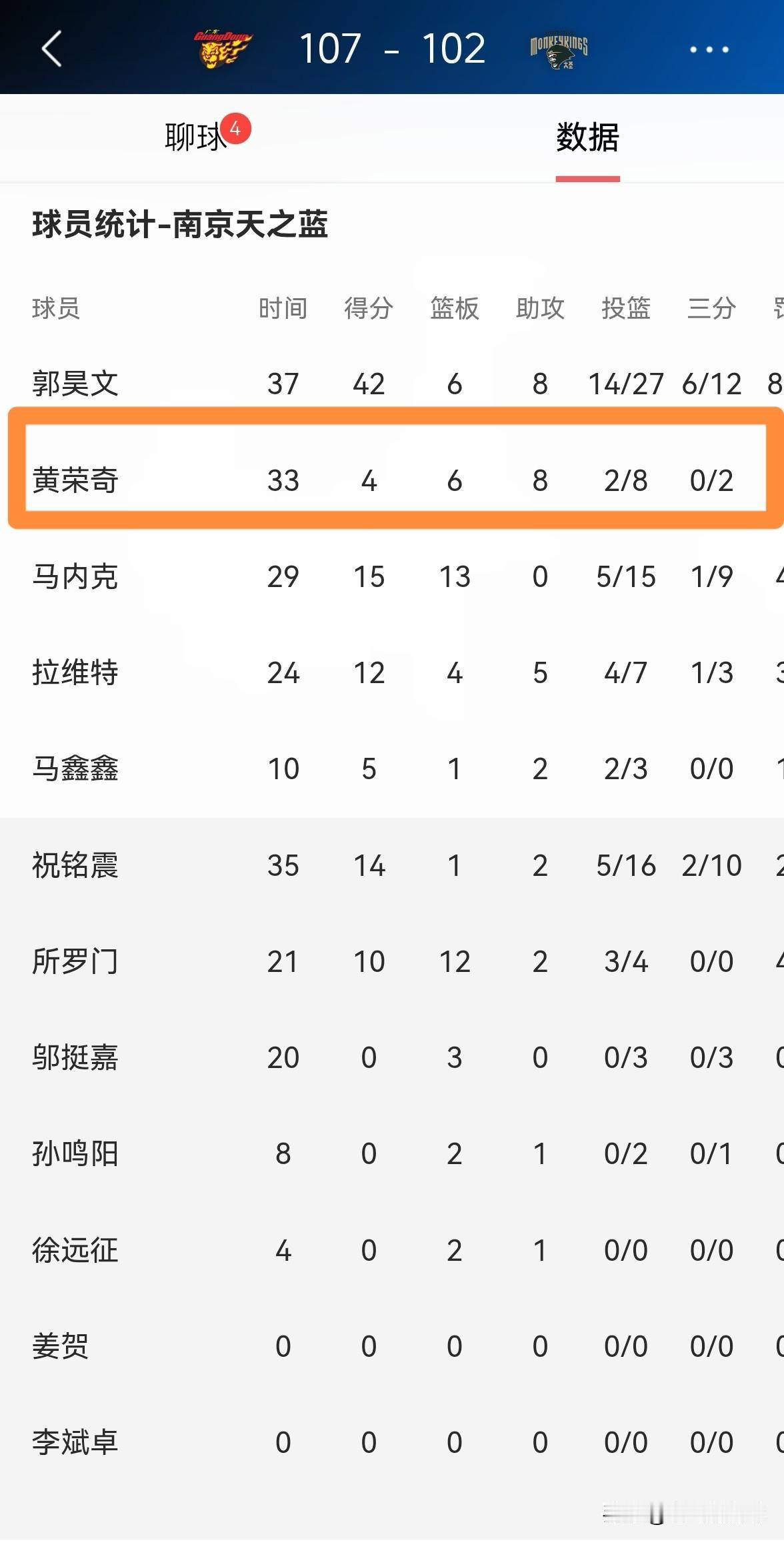 南京天之蓝大将黄荣奇真是太懂感恩了!在今天南京天之蓝客场以102:107不敌广东东阳光的比赛中,黄荣奇用一场低迷的表现回馈了老东家当初的栽培。 整场比赛下来,黄荣奇首发出战33分钟,投篮8中2非常低效的得到4分,还出现了3次失误和4次犯规,他的场上正负值为-1。