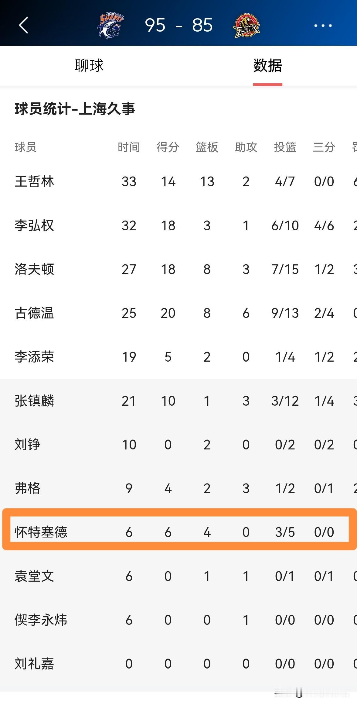 上海久事老将怀特塞德真是雄风不再!在今天上海久事主场以95:85战胜吉林长白山恩