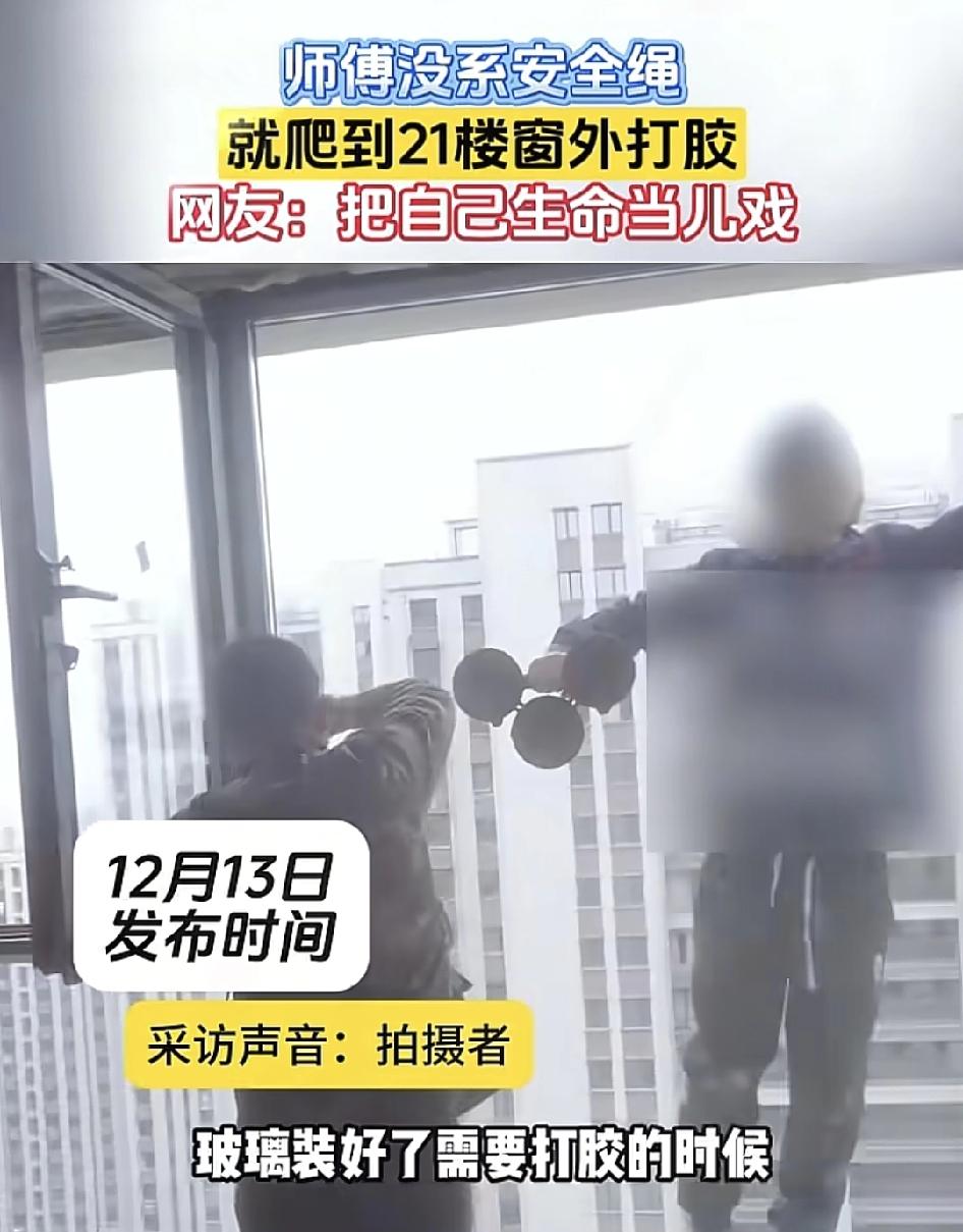 网友分享家里阳台安装玻璃时,师傅安装好玻璃,准备打胶时,一身翻窗外,没有任何的安全保障措施,当时把女子吓坏,女子称自己家住21楼。但是也不敢出声,怕师傅分心出现意外,只好用手机录下视频,有网友看到玻璃上有一个吸盘,可能对是否有固定的作用,但是一个湿盆对于这样高空作业来说,真的太没有安全保障了。