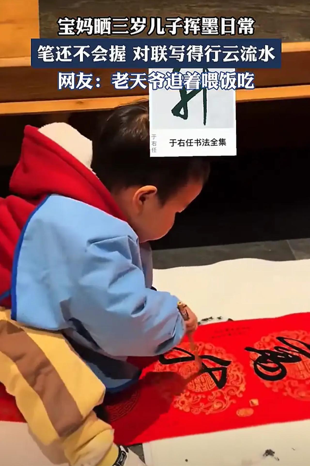 广东惠州一个三岁男童,平时拿铅笔写字歪歪扭扭握都握不住,妈妈给他毛笔让他玩,他抓着笔在纸上刷刷几下,一副对联出来了,字写得工工整整,妈妈看傻了,拍视频发到网上,连央视都转发了。 这孩子才三岁,幼儿园都还没上,平时在家妈妈教他写字,他拿笔总是握不稳,写出来的字歪七扭八,妈妈也没强求,小孩嘛慢慢来,家里老人练书法,毛笔宣纸摆了一桌子。 那天孩子看见爷爷写字,自己也凑过去要玩,妈妈想着给他玩玩算了,磨点墨水铺张纸,把毛笔递给他,孩子接过去也不用人教,抓着笔杆就往纸上落,妈妈在旁边看着准备收拾烂摊子。 谁知道孩子下笔那一刻,妈妈整个人愣住了,毛笔在他手里跑得飞快,一笔接一笔停都不停,写出来的字一个比一个漂亮,笔画转折顿挫全有,妈妈揉了揉眼睛以为看错了。 孩子写完放下笔,妈妈凑过去看,纸上是副对联,上联下联横批都齐了,字体工整得像印刷体,妈妈拿起来看了半天,问孩子谁教你的,孩子摇头说不知道,就是想写。 妈妈把视频发到网上,标题写着三岁娃写书法,没想到一下子炸了,播放量蹭蹭往上涨,评论区全是不敢相信的声音,有人说这是假的吧,三岁孩子怎么可能写成这样,肯定是大人代笔。 妈妈又拍了几个视频,从孩子拿笔到写完全程不剪辑,孩子坐小板凳上,脚还够不着地,抓着毛笔写字那架势像模像样,网友看完彻底服了,这不是练出来的,这是天生的。 央视看到视频后也转发了,配文说少年天才值得关注,视频下面评论更热闹了,有人调侃这孩子是穿越的吧,上辈子书法手艺没忘干净,这辈子接着用。 有人说这叫老天爷追着赏饭吃,别人家孩子三岁还在玩泥巴,这孩子拿起毛笔就是大师范儿,羡慕都羡慕不来,这种天赋打着灯笼都找不到。 也有人说赶紧好好培养,千万别浪费了这份天赋,三岁就能写成这样,再过几年还了得,说不定能成为书法界的新星,现在这个年代能静下心练书法的孩子太少了。 还有人分析说可能孩子前世就是书法家,这辈子一拿笔肌肉记忆就回来了,虽然听着玄乎但除了这个解释真想不出别的理由,三岁啊,认字都认不全几个呢。 妈妈看着评论又惊又喜,说孩子确实没人教过,家里也就爷爷写字他看过几眼,没想到一上手就这样,现在打算好好培养他,看看这天赋能走到哪一步。 这事提个醒,有些天赋是天生的,强求不来,但真遇到了千万别埋没,好好引导说不定就是下一个大师。 你们觉得,这孩子是不是真的穿越来的。