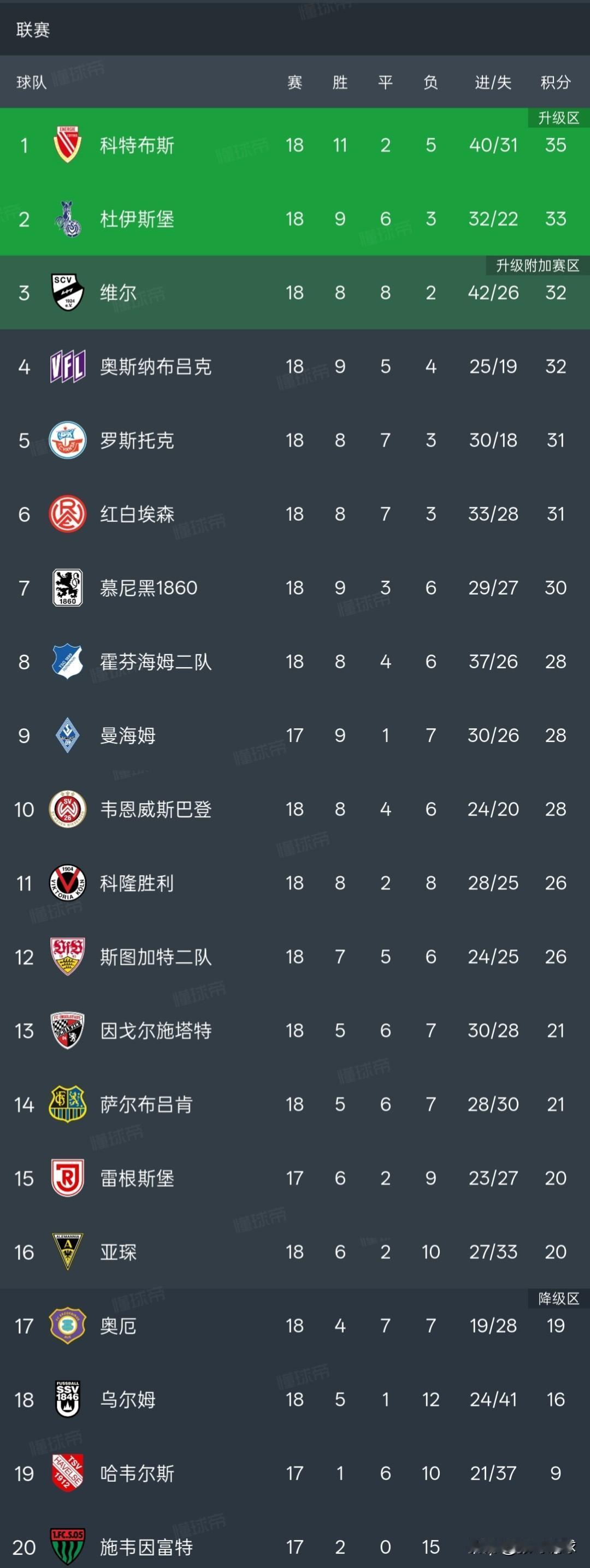 德丙积分榜丨科特布斯和杜伊斯堡位列升级区,邵佳一效力过的三支球队都在德丙,慕尼黑1860近期拿到一波四连胜排名上升到第七位,德丙前七名之间只相差5个积分。