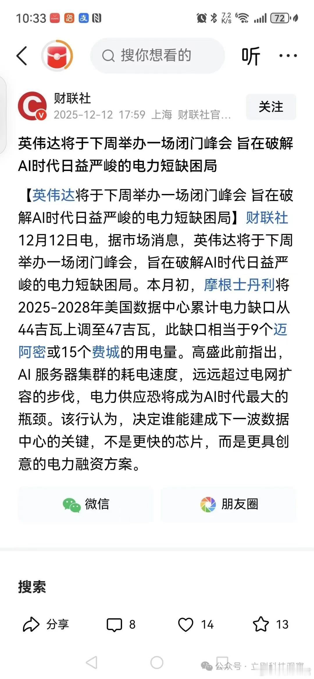 美国讨论电力短缺中国没有资格参加下周一英伟达将召开一次闭门会议,讨论破解AI时代能源短缺的问题。这样的一次闭门会议,中国是没有资格参加的,因为中国没有电力短缺这件事情。人工智能的发展,也就建了这么点智算中心,就把美国的电力弄短缺了,这件事情很难令人相信,然而它却是真实的发生了。现在美国的数据中心的电力缺口。大约是47吉瓦,据说这相当于9个迈阿密的用电量,这样看起来,似乎美国的数据中心电力缺口很大,所以英伟达这样的企业都很焦急。人工智能最后的差距,根本不是什么芯片,而是电力,没有电你做什么智算,你有再快的芯片,顶不上我们有电。计算能力越强,耗电就越多,这个根本没有办法改变,没有电你就没有人工智能。大家看美国数据中心一年电力缺口47吉瓦时,觉得这个数据很大,很不得了。中国一年新增发电量是多少?430吉瓦。这是什么意思,美国那个大缺口,对于中国新增发电量来说,就是一个小零头。你才缺47吉瓦,我一年新增是430吉瓦,那点电对中国来说算什么?听过我的课的人都知道,我每次讲课开篇都要讲这个世界的基础,这个世界是材料、能源和信息组成的。要做信息化,要做人工智能,离不开材料和能源。我毫不怀疑,人工智能的发展,中国会把美国远远的甩在后面,我以前认为美国重视算力,中国重视场景和应用,这是两条不同的路,都会有自己的特点。现在我发现,美国的算力也不可能领先中国,一方面中国芯片的能力会赶上来,第二方面算力需要芯片,算力更需要能源。美国的电力是不可能追上中国。中国发电能力的领先,首先是制度决定的,作为一个大一统的国家,中国的电力可以进行全国性的调度,所谓西电东输,西部利用自己的自然资源,建立起了水电、风电、太阳能发电的强大能力,这些电力不仅仅是本地使用,而且通过几十条特高压线路,输送到大量需要电力的东部。中国的电网是一张电网,可以统一调度资源。美国至今没有一条特高压,有数个的电力公司供电,主要服务当地。资源不够的地方,供电就非常紧张,没有办法从外地调来电力。新的能源技术,尤其是清洁能源技术,美国已经无法和中国比拟,风力发电、太阳能发电、水力发电,这些新兴的发电技术,美国不但和中国有差距,成本是中国的几倍,甚至是几十倍。一个零散的供电系统,落后的发电系统,仅仅一个人工智能的智算,就把美国的发电问题凸显出来,成为一个急需解决的大问题。这不仅是人工智能对于电力的需求,其实这是美国整个供电系统的危机,美国的供电能力很差,技术已经落后,跟不上时代发展。这才是美国的根本问题。就是现在美国开始建设电力系统,没有3~5年也很难建设好,这相对中国远远落后了。这一轮人工智能的智算中心建设,中国建设起的智算中心数量远远超过美国,中国还有大量的存储中心、计算中心,消耗了非常多的电力。但是我们基本没有听到在中国关于电力短缺的讨论,因为电力是足够的,而且新能源发电还在不断的增长,大量的清洁能源项目被建设起来,甚至垃圾焚烧发电,垃圾都不够了。今天中国人的夏天都开着空调,包括很多农村都开着空调,冬天广泛在使用电热毯、电暖器,我们很少听到拉闸限电这样的事。真正的国力就是基础实力,连电都不够,还做什么人工智能智算?中国会在这个领域大大的拉开美国,越往后走,是差距会越大。