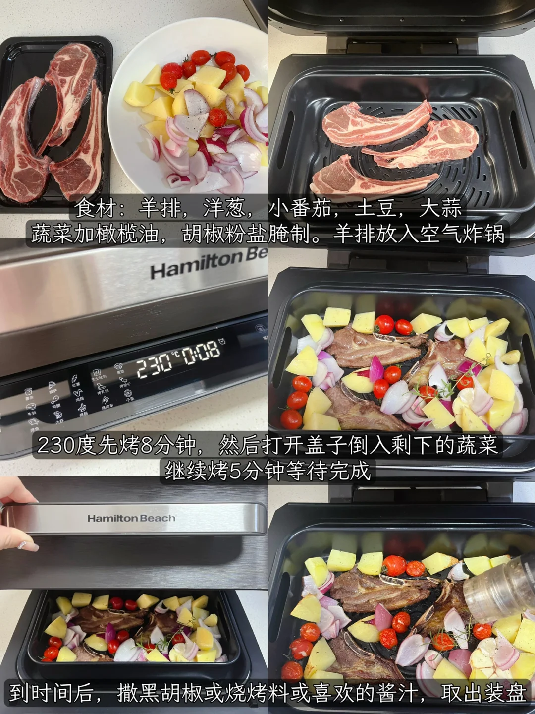 “室友”说想吃烤羊排了,安排上~正好体验一下新收到的汉美驰空气炸锅,独特的开盖方式有让我眼前一亮呀~6L大容量和长方形的大烤盘确实也比我家之前的空气炸锅能装,40-230 度广域控温,230度的高温烤出来的羊排外焦里嫩,鲜嫩多汁~过程还不用翻面真是省时省力~