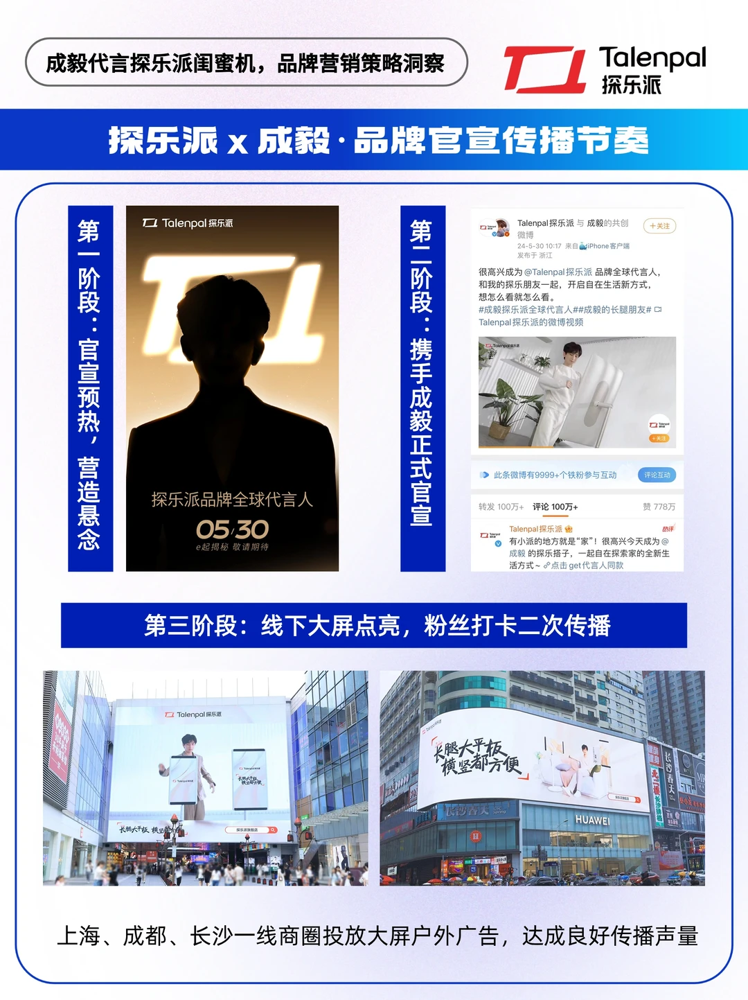 代言人是广告宣传的符号化、人格化。 一个与品牌契合的代言人,可以使品牌的传播更加具体、有温度👍🏻 成毅——长相帅气、演技在线的实力派演员 探乐派闺蜜机——高颜长腿,硬核科技的长腿大平板 在内核上,成毅的松弛感气质也与探乐派的自在生活方式不谋而合。 官宣不到两天时间,自带流量的成毅,W博上的成毅探乐派全球代言人 话题,便已突破2.2亿阅读量,588.4万的讨论量。有节奏的营销策略,让探乐派闺蜜机一经上市推出便获瞩目、突破圈层传播🔥 探乐派这波营销,你给多少分?🤔