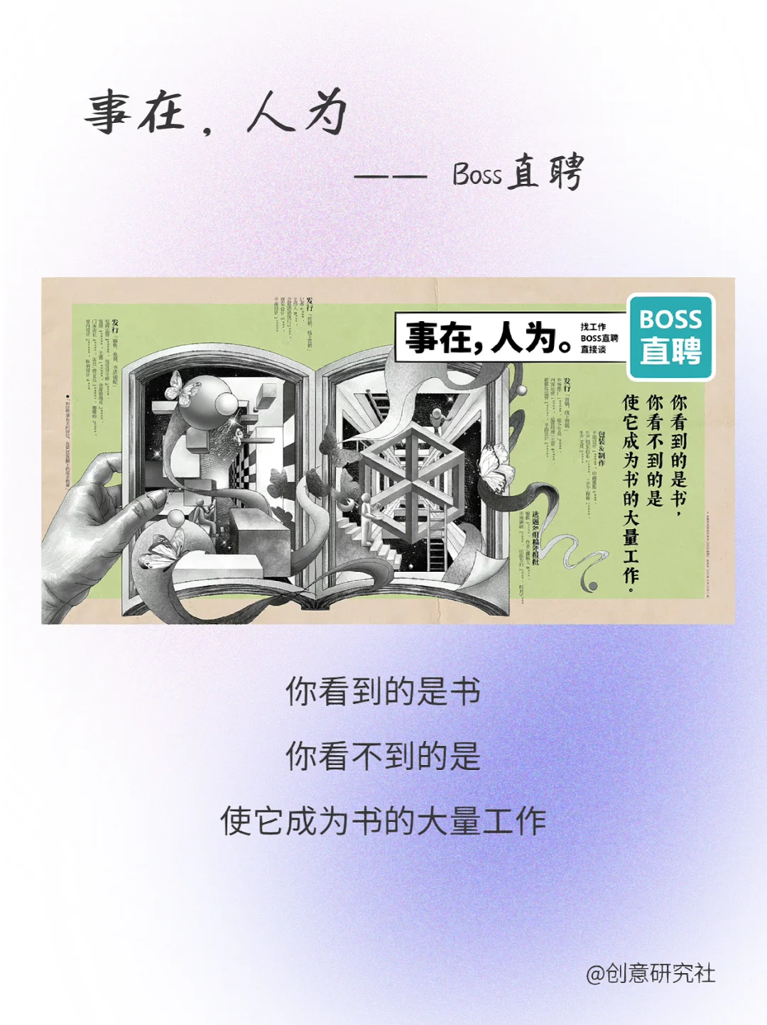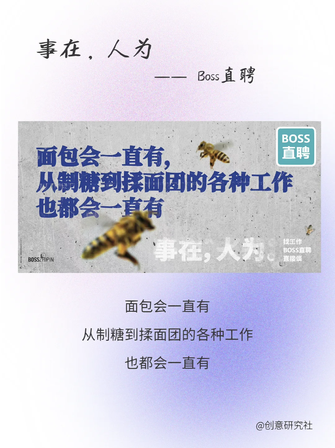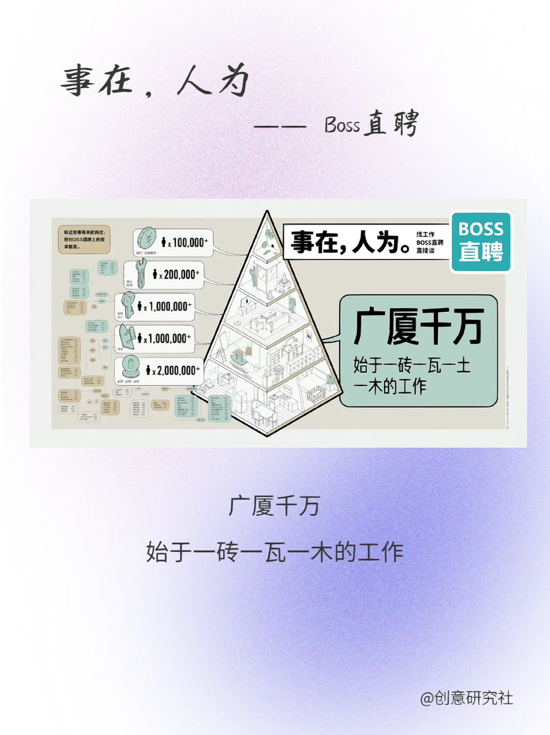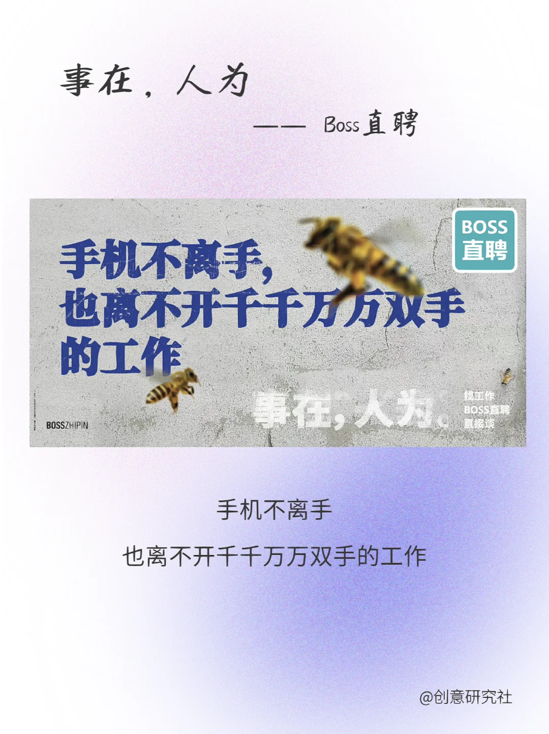 一开始,“找工作,我要跟老板谈” 这一次,BOSS直聘的文案:事在,人为 每份工作背后都有无数颗“螺丝”在合力运转,致敬那些平凡而伟大的岗位。 对“事在人为”的新解读,也是对社会的细致洞察。 事在,人为 别担心 该有的岗位,以后仍旧会有[红色心形R]