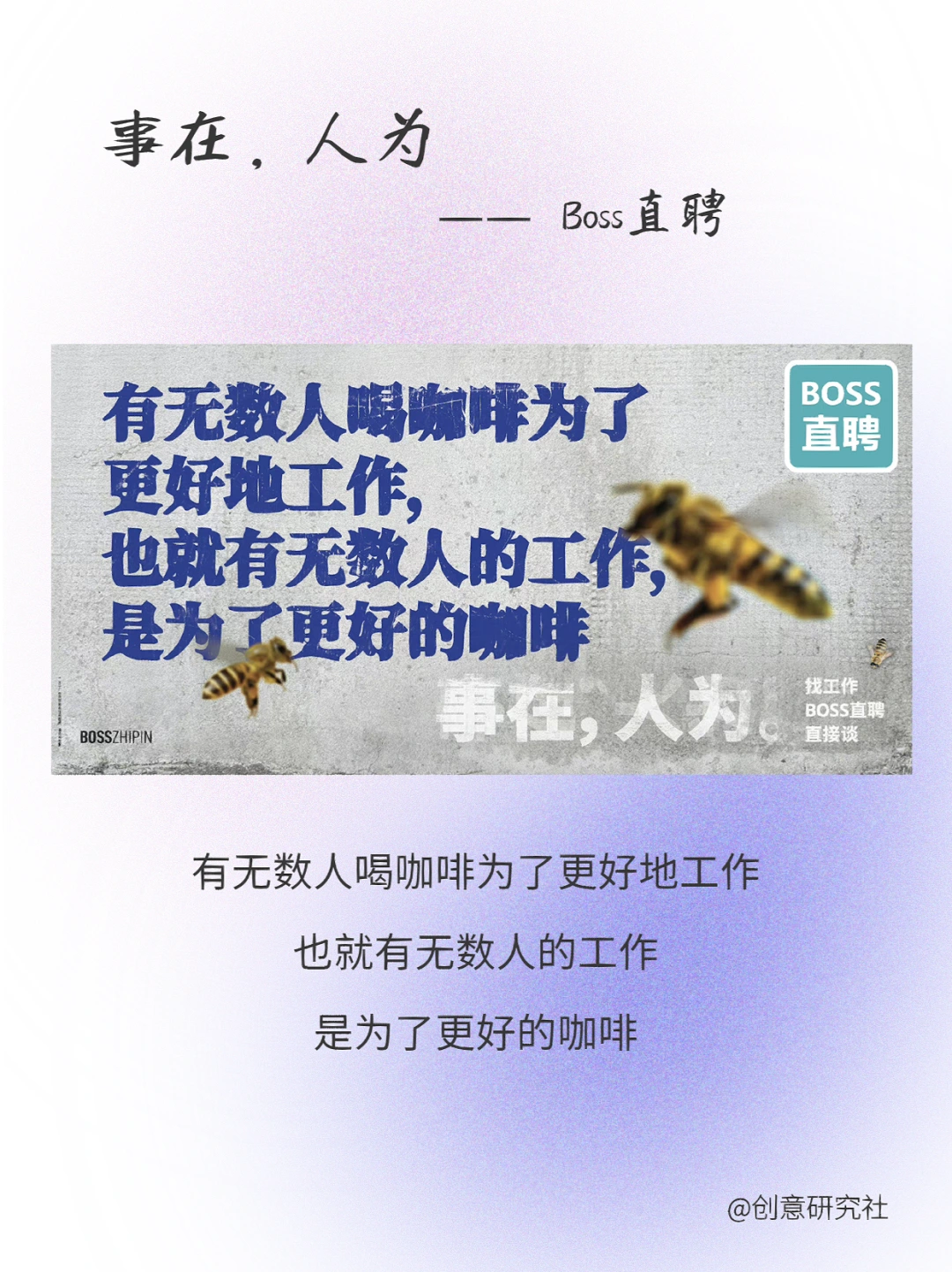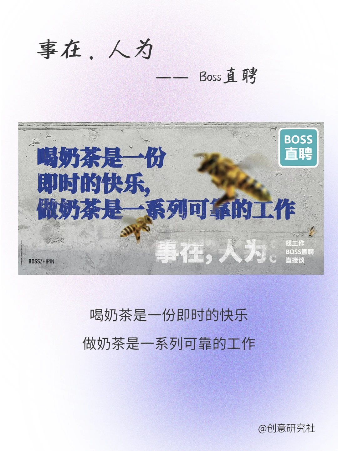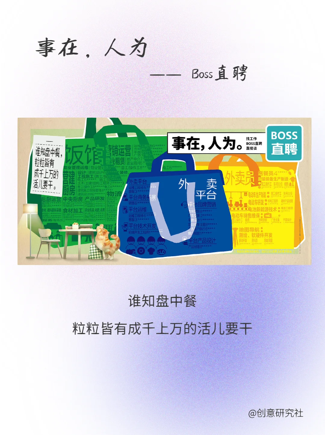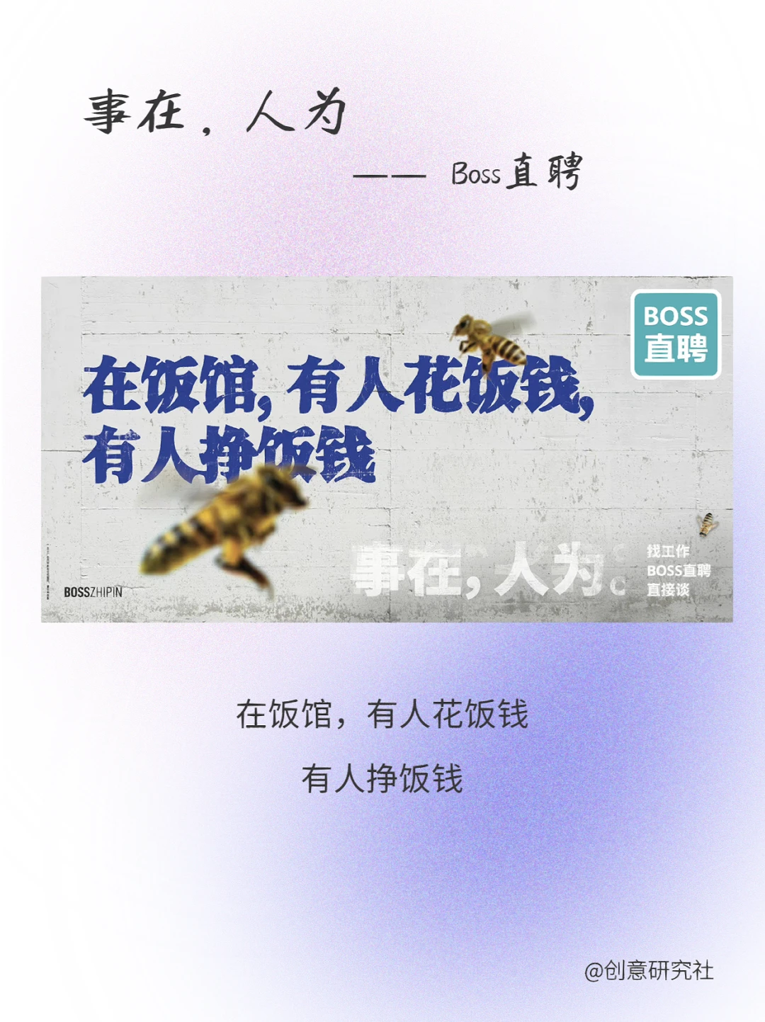 一开始,“找工作,我要跟老板谈” 这一次,BOSS直聘的文案:事在,人为 每份工作背后都有无数颗“螺丝”在合力运转,致敬那些平凡而伟大的岗位。 对“事在人为”的新解读,也是对社会的细致洞察。 事在,人为 别担心 该有的岗位,以后仍旧会有[红色心形R]