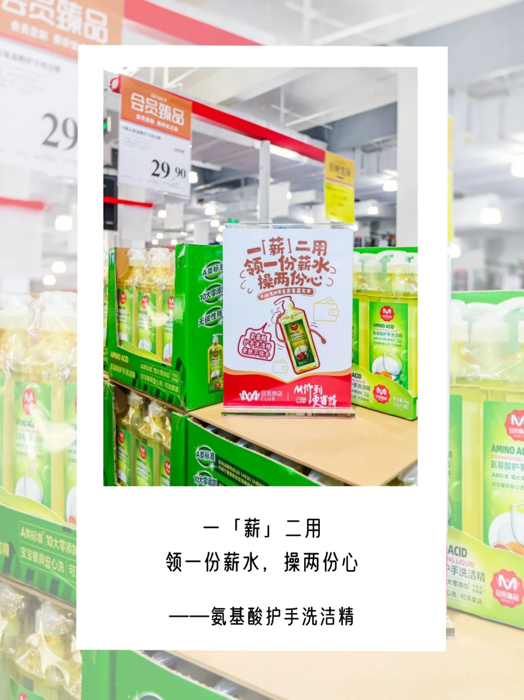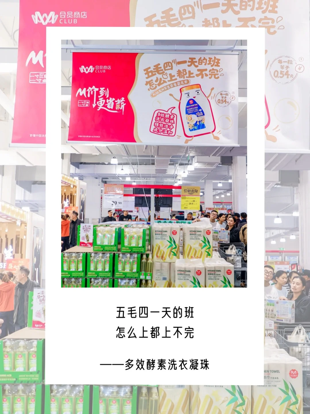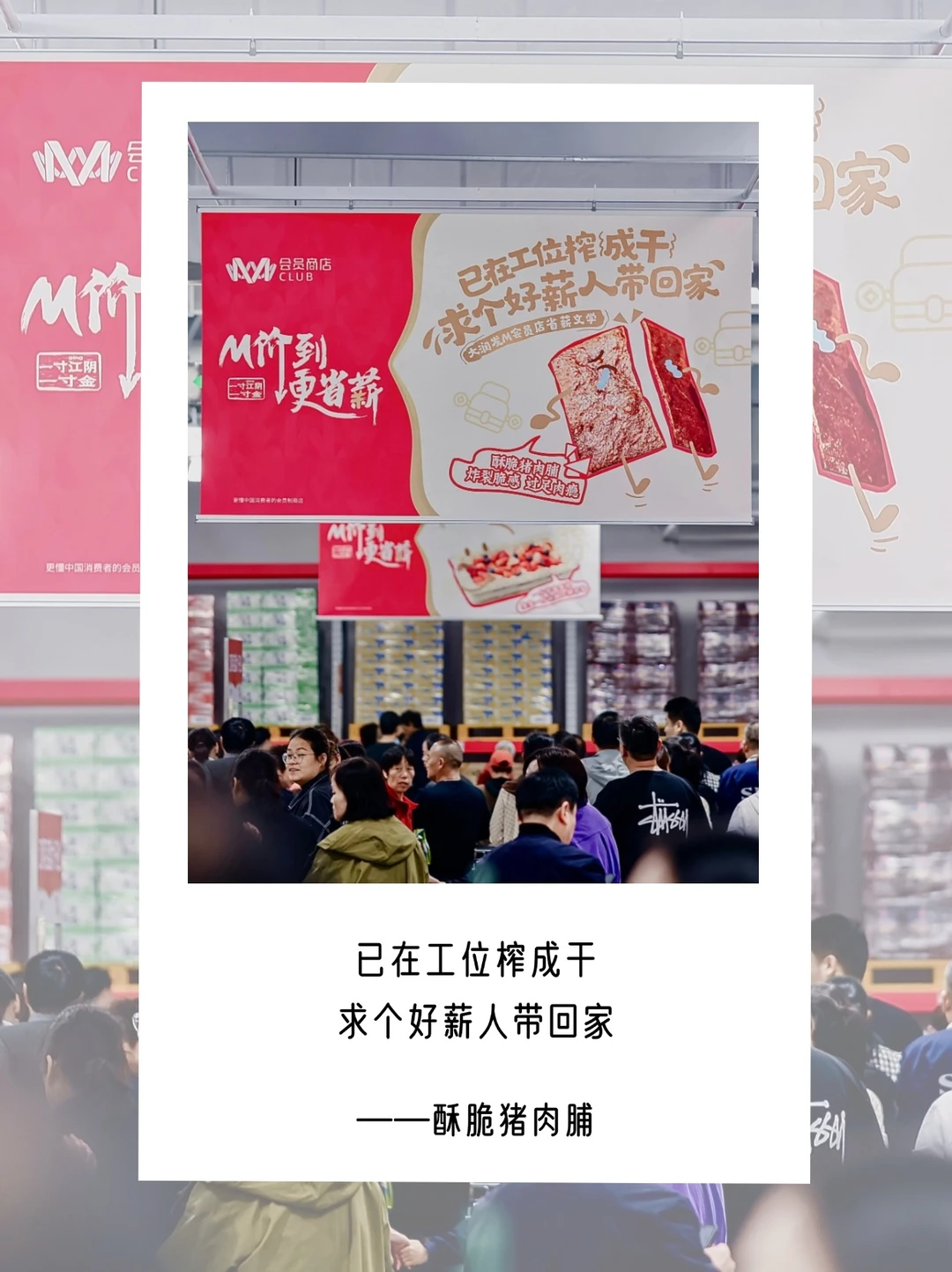 M会员店通过对社会现象和职场环境的敏锐洞察,捕捉消费者的心理,以调侃式口吻融入到文案中,使其更具吸引力和感染力。比如:“五毛四一天的班,怎么上都上不完”,照进职场现实,与“月入三千笑嘻嘻”的调侃,有异曲同工之妙。