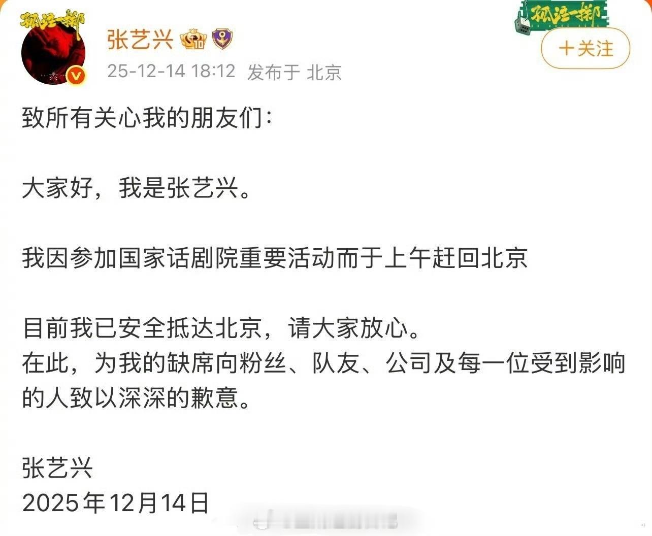 张艺兴发文道歉张艺兴发文回应未参加EXO见面会:说是因为自己的原因不能参加见面会,向粉丝、公司,队友道歉……大概就是,张艺兴在韩国训练了一个多月~今天exo的见面会,他有重要活动上午回北京了…把错都揽自己身上了😹然后因为很多粉丝已经到韩国了,于是张艺兴发文道歉!一句不可抗因素,轻描淡写,一笔带过。呵呵 张艺兴 国家话剧院活动