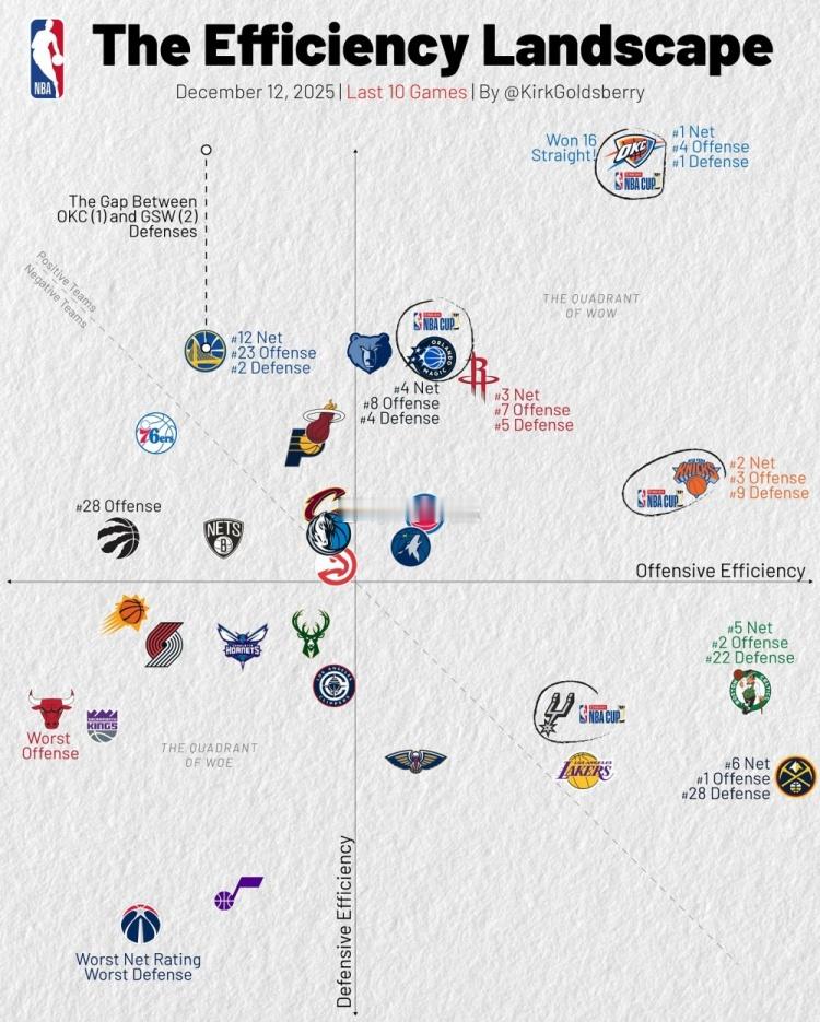 近10战:雷霆攻防均前4 火箭攻7守5 湖人攻强守弱 勇士守强攻弱注:横轴代表进攻效率,越靠右越好,纵轴代表防守效率,越靠上越强。第一象限的球队多为发挥出色的球队,而在第三象限的球队通常为战绩比较糟糕的球队。