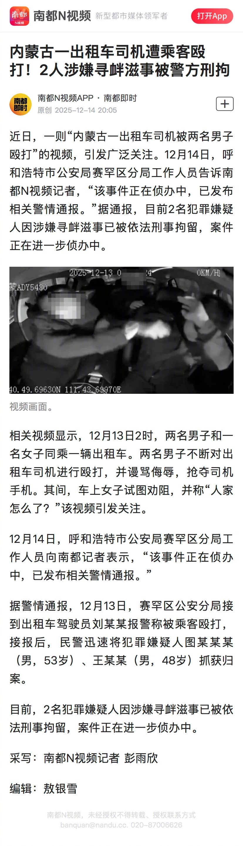 #呼市警方通报出租车司机被殴事件#【内蒙古一出租车司机遭乘客殴打!2人涉嫌寻衅滋事被警方刑拘】 #内蒙古2男子殴打出租车司机被刑拘#近日,一则“内蒙古一出租车司机被两名男子殴打”的视频,引发广泛关注。12月14日,呼和浩特市公安局赛罕区分局工作人员告诉南都N视频记者,“该事件正在侦办中,已发布相关警情通报。”据通报,目前2名犯罪嫌疑人因涉嫌寻衅滋事已被依法刑事拘留,案件正在进一步侦办中。南都N视频记者 彭雨欣