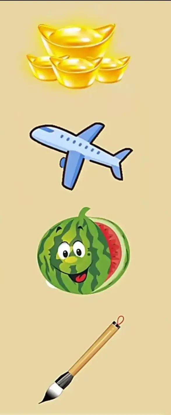 猜谜语,动脑筋 这就叫顺应了那一句老活 流水不腐,户枢不蠹。 人的智慧脑,小脑长期不用,就会慢慢程旧 到时人自随时间匆匆变老,字写不来了,事记不住了… 这个成语谜圈真是绝无仅有 四样物品 没有一个汉字提示 一堆金光闪闪的金元宝 一架飞机 一个切开的西瓜 一支能写能画的毛笔
