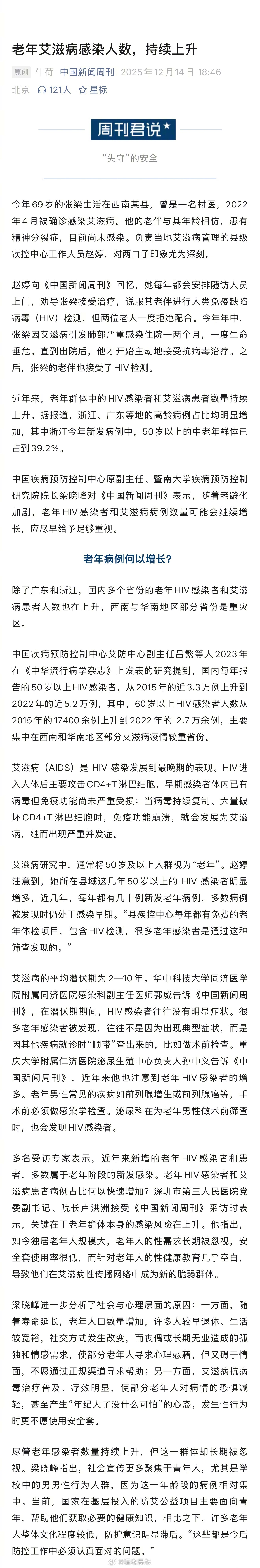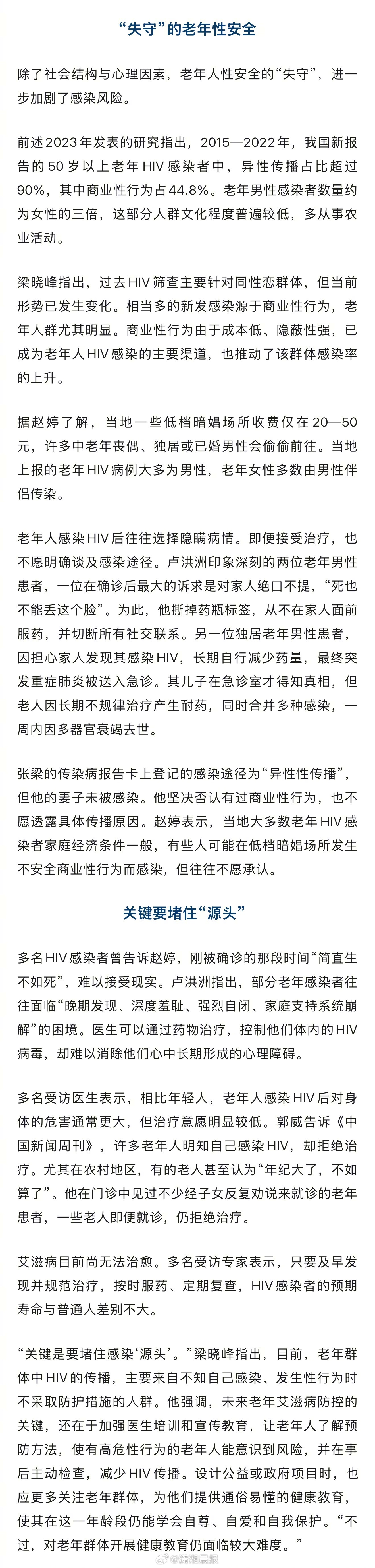 【“失守”的老年性安全 县疾控工作人员:#部分老人去收费几十元的性交易场所#】#感染艾滋病老人称死也不能丢脸# 今年69岁的张梁生活在西南某县,曾是一名村医,2022年4月被确诊感染艾滋病。他的老伴与其年龄相仿,患有精神分裂症,目前尚未感染。负责当地艾滋病管理的县级疾控中心工作人员赵婷,对两口子印象尤为深刻。赵婷向回忆,她每年都会安排随访人员上门,劝导张梁接受治疗,说服其老伴进行人类免疫缺陷病毒(HIV)检测,但两位老人一度拒绝配合。今年年中,张梁因艾滋病引发肺部严重感染住院一两个月,一度生命垂危。直到出院后,他才开始主动地接受抗病毒治疗。之后,张梁的老伴也接受了HIV检测。近年来,老年群体中的HIV感染者和艾滋病患者数量持续上升。据报道,浙江、广东等地的高龄病例占比均明显增加,其中浙江今年新发病例中,50岁以上的中老年群体已占到39.2%。中国疾病预防控制中心原副主任、暨南大学疾病预防控制研究院院长梁晓峰对表示,随着老龄化加剧,老年HIV感染者和艾滋病病例数量可能会继续增长,应尽早给予足够重视。据赵婷了解,当地一些低档暗娼场所收费仅在20—50元,许多中老年丧偶、独居或已婚男性会偷偷前往。当地上报的老年HIV病例大多为男性,老年女性多数由男性伴侣传染。老年人感染HIV后往往选择隐瞒病情。即便接受治疗,也不愿明确谈及感染途径。深圳市第三人民医院党委副书记、院长卢洪洲印象深刻的两位老年男性患者,一位在确诊后最大的诉求是对家人绝口不提,“死也不能丢这个脸”。为此,他撕掉药瓶标签,从不在家人面前服药,并切断所有社交联系。(中国新闻周刊)