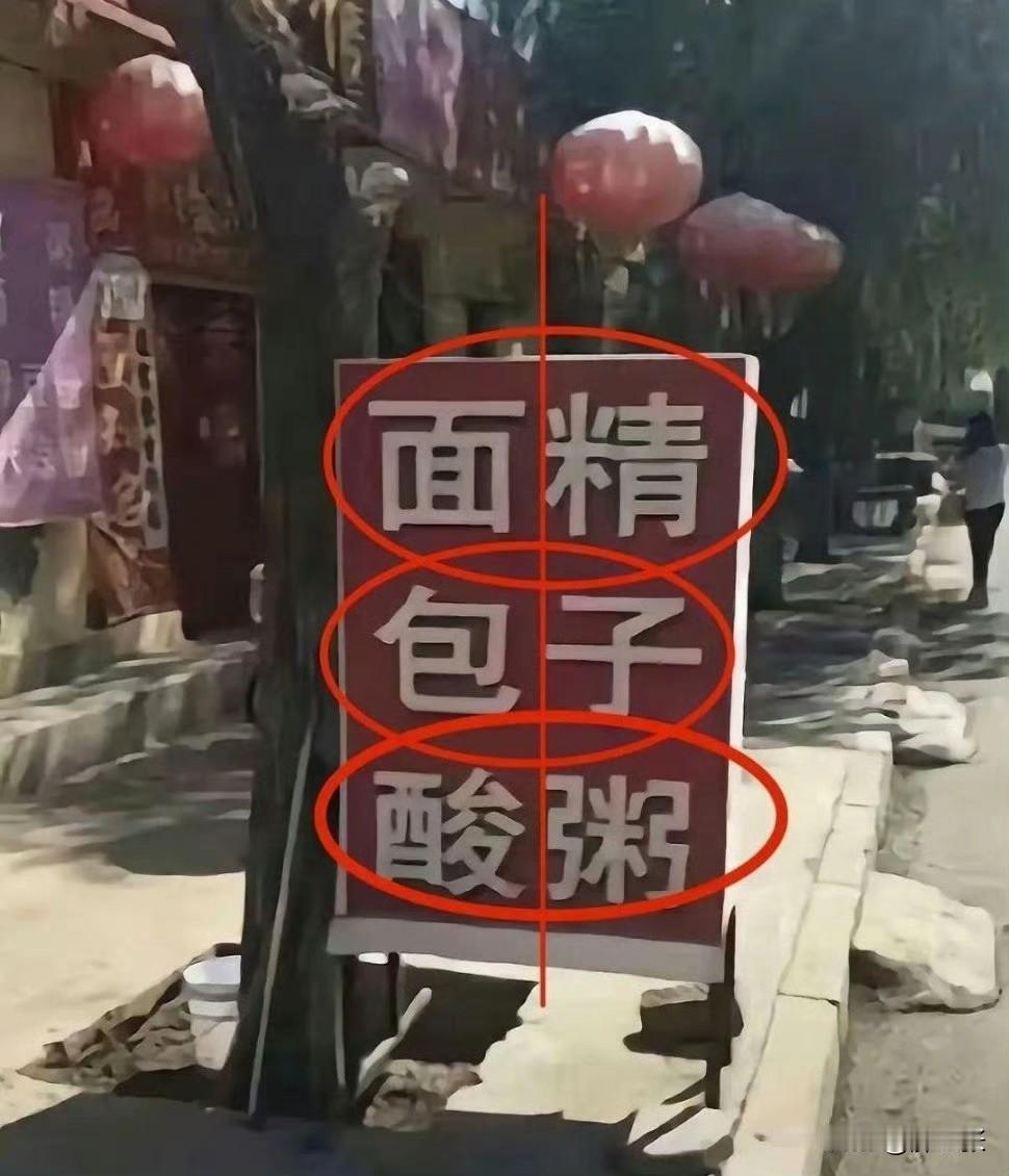 这招牌真的是认真的吗?感觉横竖怎么读都挺别扭的! 竖着读有点流氓,而且也不是很通顺,可是横着读吧,“面精、酸粥”这也不是很通顺啊! 这老板是不是做完广告牌自己没有仔细看啊?还是我的理解能力欠佳? 有没有懂得,说一下这个要怎么读!