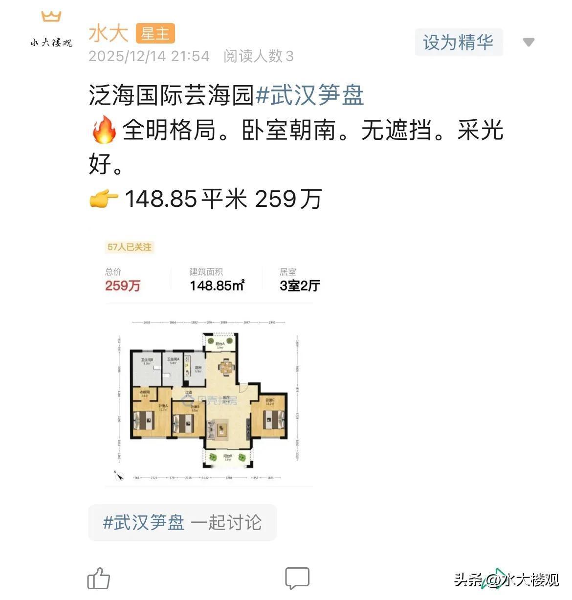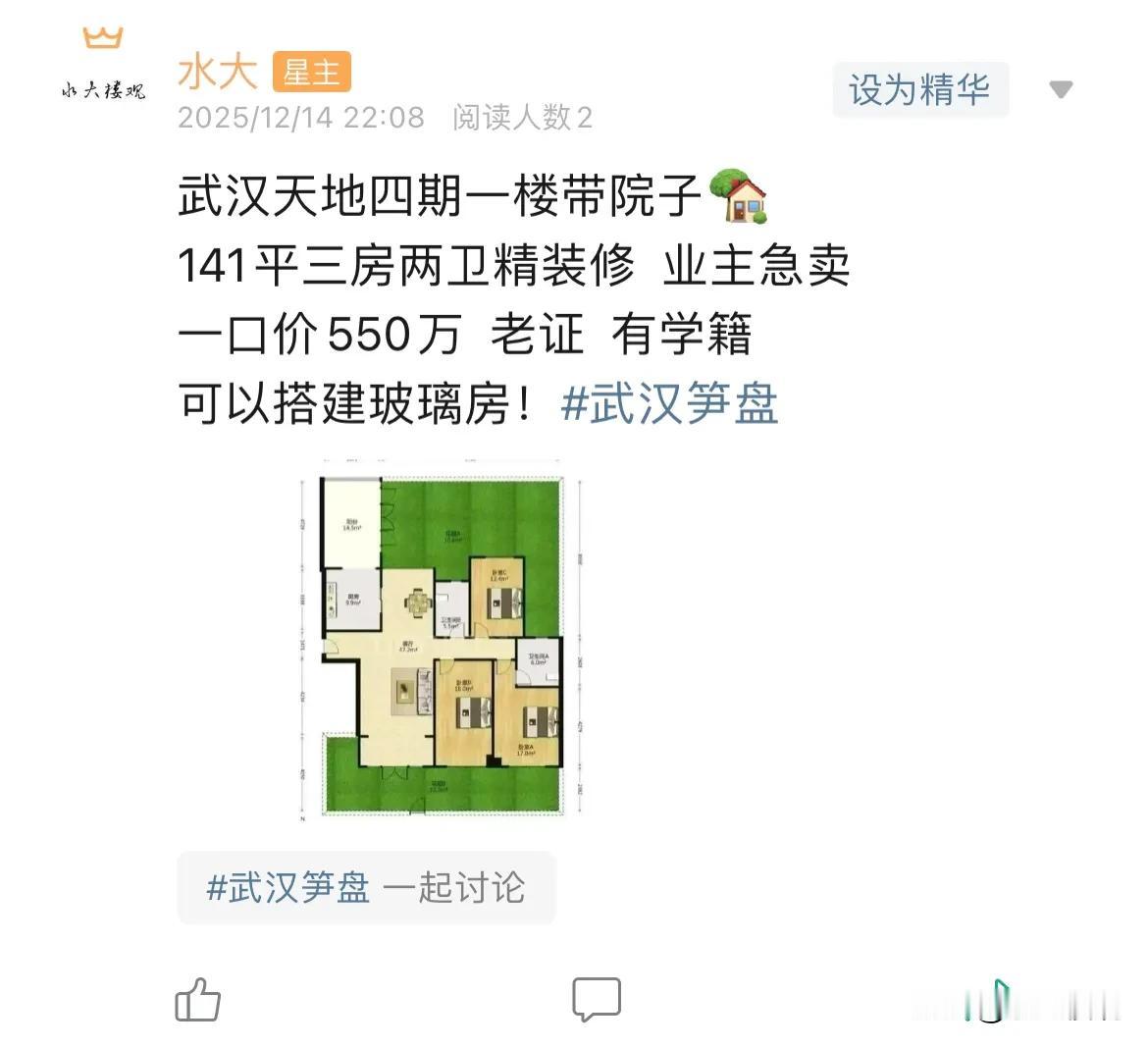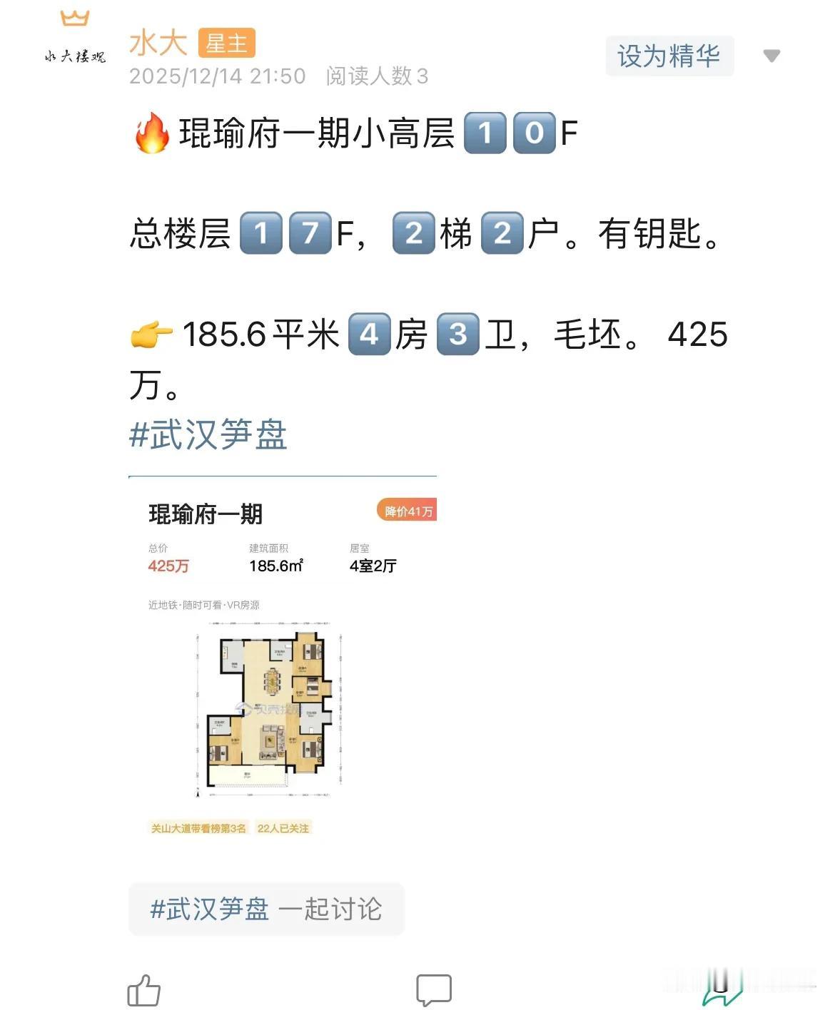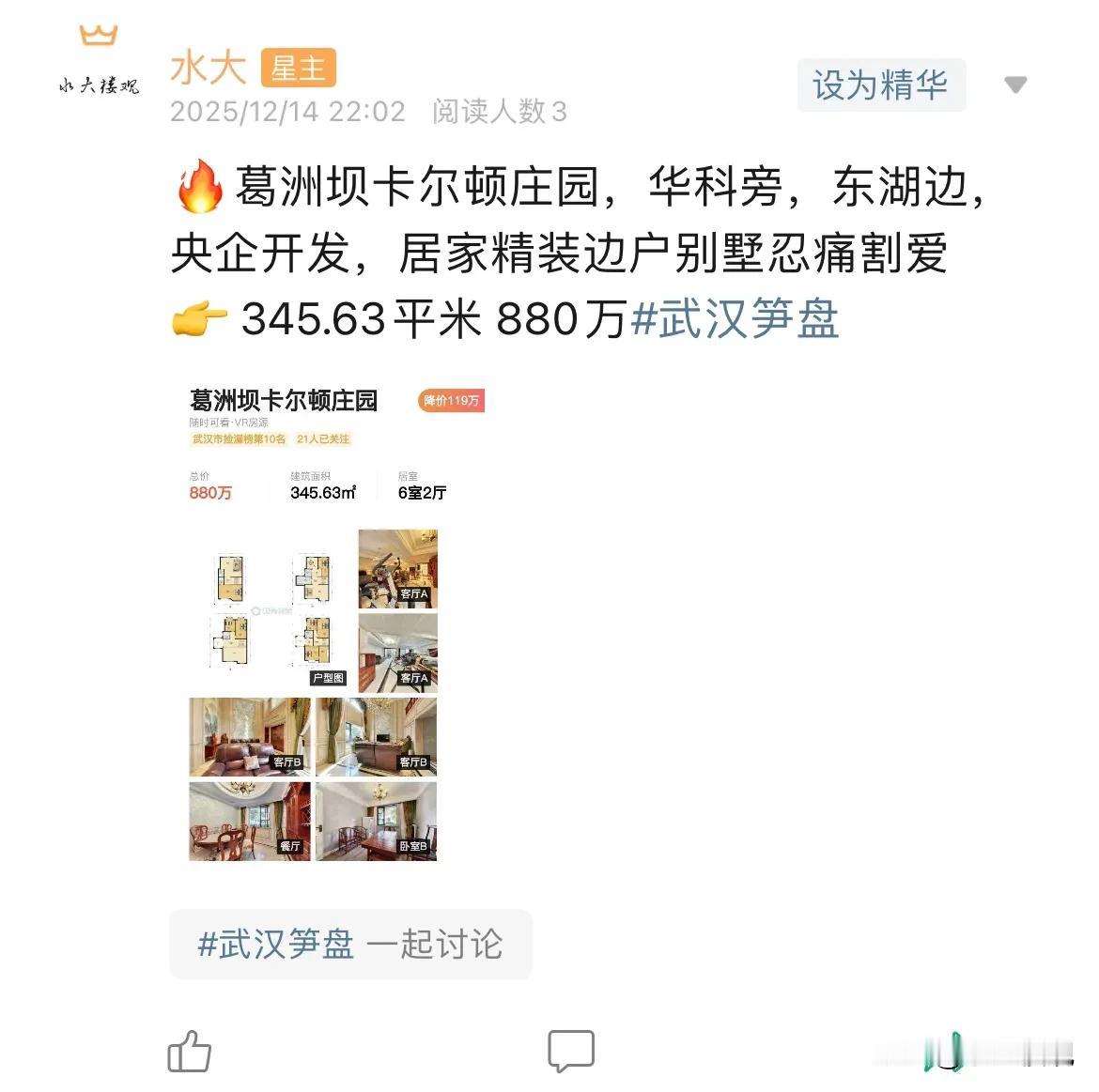 今日美居 后湖这个价格了。 关山大道大家只知道泛悦城有小高层,实际上琨御府也有小高层,但是价格没有那么高。 泛海南北通透双阳台的房子,眼看就要2以下了。 昔日神盘大公馆,价格1.4。 别墅精装价,再友好一点,就跟之前的大平层价格差不多了。 武汉天地6层洋房,4以下了。 房价已经止跌回稳,各位不要错判形势,该买就要买,中国经济前景无限,中国房地产目前健康水平空前,具有极大的购买价值,有需要的,不要犹豫,马上买!