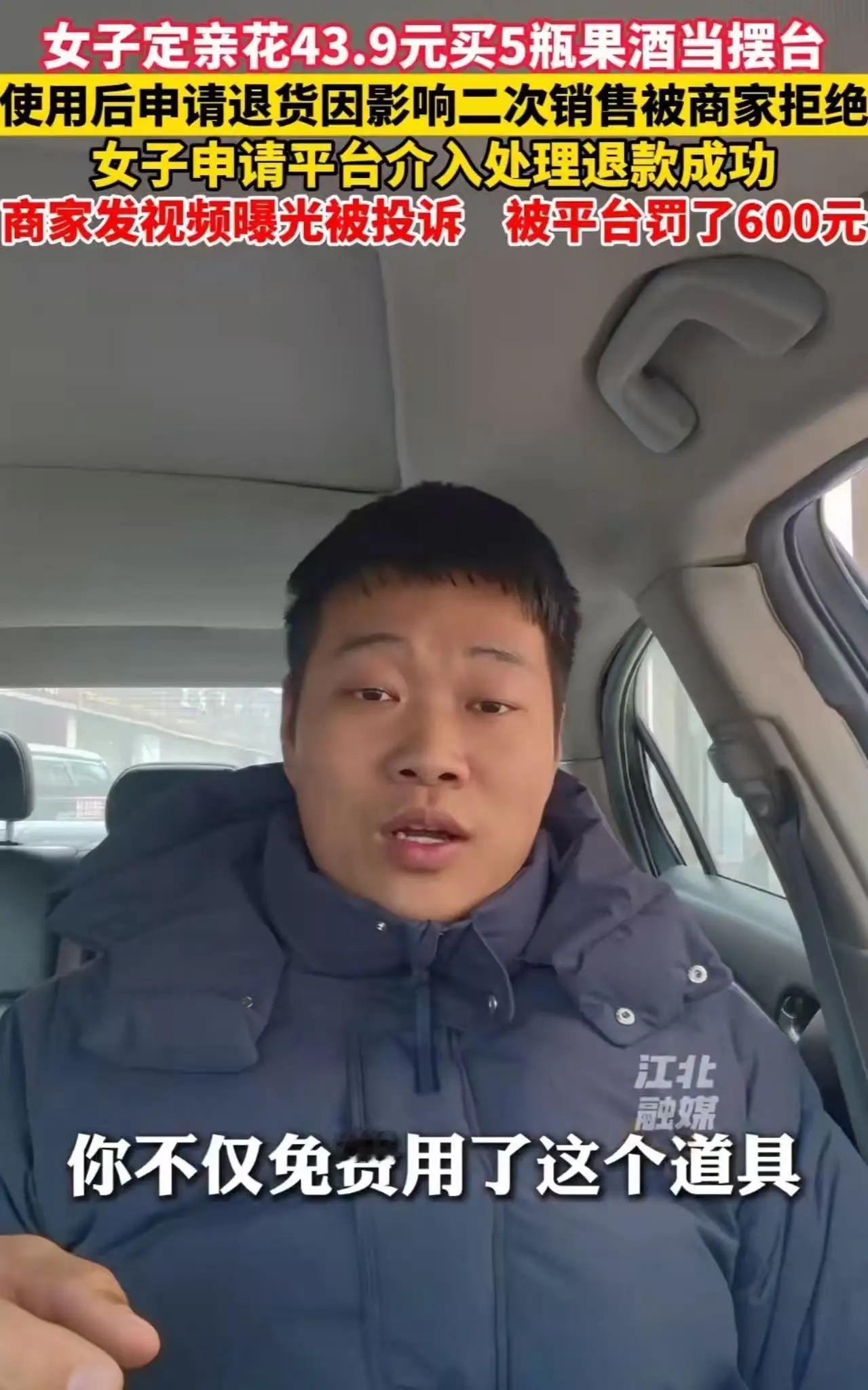 无奇不有! 山东潍坊,李女士家里办喜事,花43.9元在网上精心挑选了5瓶果酒当婚礼摆台,用完就退,包装丢了,喜字用了,还让商家倒贴运费。商家拒绝退款,女子:“谁规定买了货用了不能退货的?你这样玩不起,你开什么店铺?”这几句话,不仅把商家问得一脸懵圈,也让网友目瞪口呆! 此事引发热议,有网友说,结婚43块都要白嫖,颠到没皮没脸了! 她能退酒,在网上买的其他定亲用品用过也会退! 也有网友说, 这位李女士订婚了,男方家以后那可有福气了,有这么会过日子的老婆! 然而,事情远没有表面那么简单。就在网友们纷纷发表自己的看法时,却很少有人注意到一个细节——李女士的“巧妙操作”,其实折射出我们这个时代的一种普遍心态:在规则和底线之间游走,寻找那一丝“灰色地带”的快感。 你是否曾在生活中遇到过类似的“聪明”策略?明明知道规则不允许,却偏偏要试一试,看看能不能“逢场作戏”地突破底线。这种行为,表面上看似“精明”,实则折射出一种对规则的蔑视和对利益的极端追求。李女士的“退货”行为,似乎在告诉我们:只要你敢试,就有可能“占到便宜”。 但这背后隐藏的,是我们对“诚信”的质疑和对“公平”的反思。我们是不是也在无形中接受了某种“规则可以被挑战”的潜规则?在这个快节奏、利益至上的社会里,很多人都在寻找“破局”的办法,甚至不惜以“打擦边球”的方式去试探底线。 更令人深思的是,李女士的行为引发的争议,究竟反映了社会的某种价值观偏差?还是仅仅是个别现象?答案或许都不是。它折射出的是一种普遍的心态:在规则的边缘试探,期待“灰色地带”能带来意外的利益。 这件事,也让我们不得不反问:在这个看似“规则至上”的社会,真正的底线在哪里?我们是应该一味遵守规则,还是要学会在规则中找到自己的生存之道?或许,最重要的,不是“怎么玩得起”,而是我们在追求利益的同时,是否还能保持那份最基本的诚信和底线。 每个人都在用自己的方式“玩转”这个社会,但最终,谁能在规则和底线之间找到那份平衡?或许,真正的智慧,是在不触碰底线的前提下,找到最大化的利益。毕竟,社会的健康发展,离不开每个人的诚信守约。而那些“聪明”的行为,终究只是短暂的“聪明”,而不是长久的智慧。婚庆果酒 不能失去底线