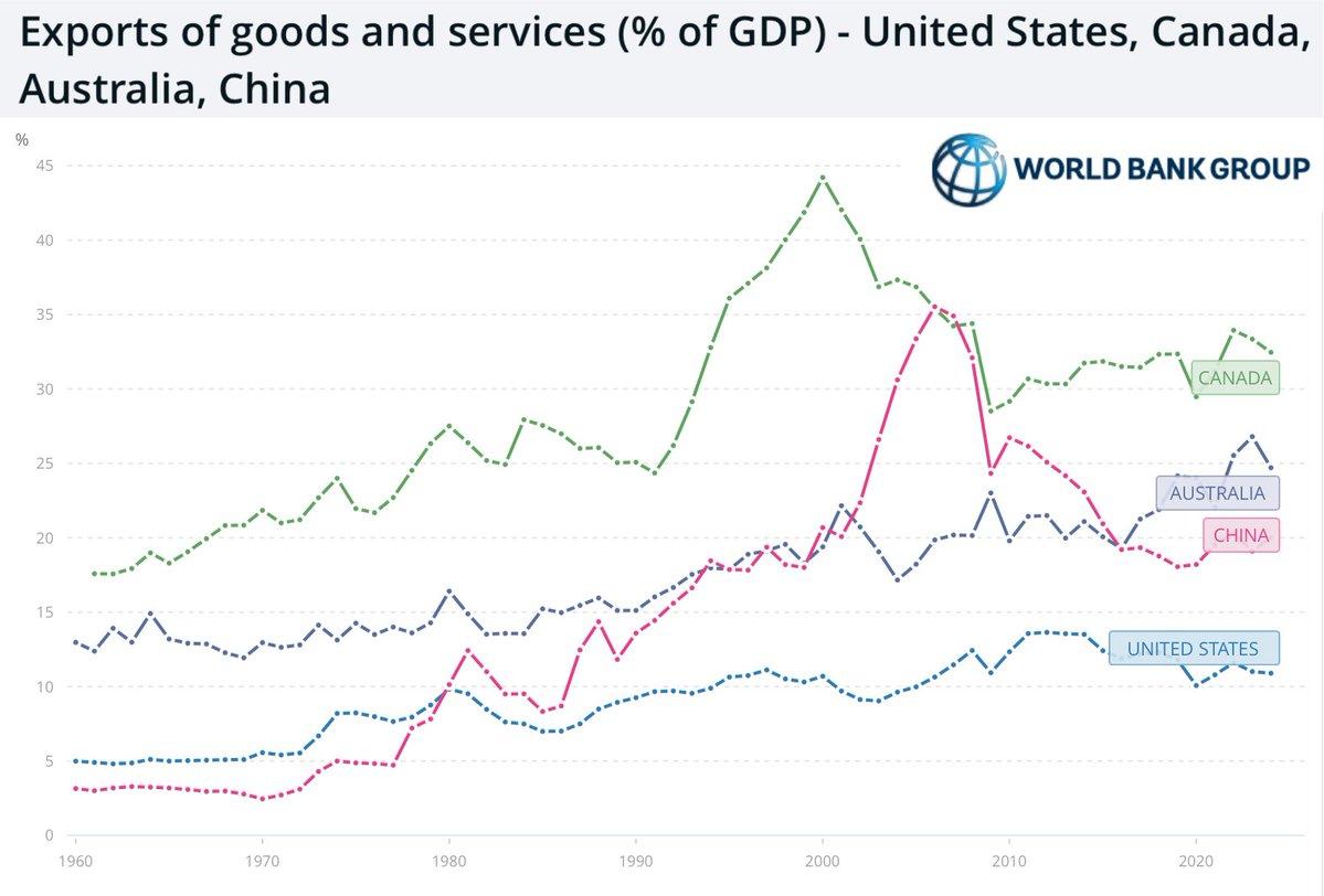 中美澳加,四国出口与GDP占比的比较,当然澳加和中美体量不在一个数量级