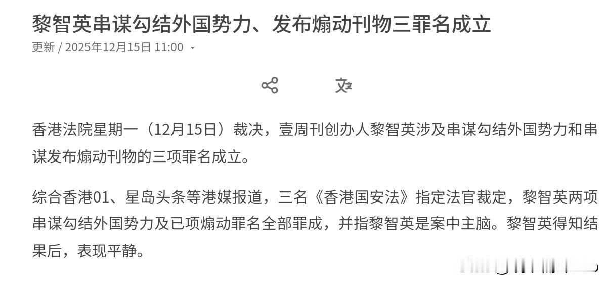 罪有应得,黎智英罪名成立!12月15日,根据外媒报道,香港法院作出裁决,壹周刊创办人黎智英涉及串谋勾结外国势力和串谋发布煽动刊物的三项罪名成立。而这一裁决的落地,这意味着等待黎智英将会是牢底坐穿的命运。但毫无疑问,此人是罪有应得。 在宣判现场包括美国、英国、法国、意大利、比利时、瑞士、新西兰及欧盟等的代表均出席旁听,这些西方国家明显是想要通过这种方式,对我们施加某种压力,但在我们内政问题上,我们司法绝不接受这种压力的干扰。当初黎智英跳的很凶,其手底下控制的媒体专注报道抹黑中国的新闻,通过夸张标题、不实内容制造舆论混乱抹黑特区政府和警方。 并且公然宣称香港“在为美国而战”,甚至妄求美国动用核武器对付中国。在香港“占中”事件中,黎智英本人就是幕后金主和操手之一。很显然,黎智英的多项罪名成立,这就是对其恶行的总清算。事实证明,这些乱港,祸港分子当初有多嚣张,现在就有多惨。当域外势力的走狗,最终也免不了被抛弃的命运。现在谁也救不了黎智英,即便域外势力想在要做一些文章,现在也是兴趣缺缺了。
