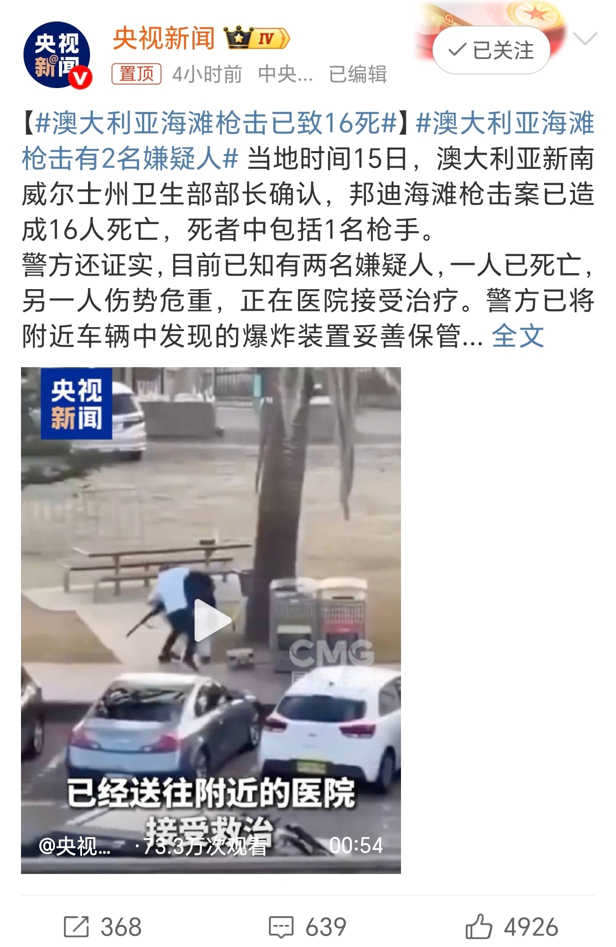 澳大利亚海滩枪击已致16死太揪心了…不敢想那些奔跑逃生的人、护住孩子的父母,还有永远失去家人的家庭有多痛。万幸有路人徒手夺枪的勇气,!愿逝者安息,伤者早日康复!
