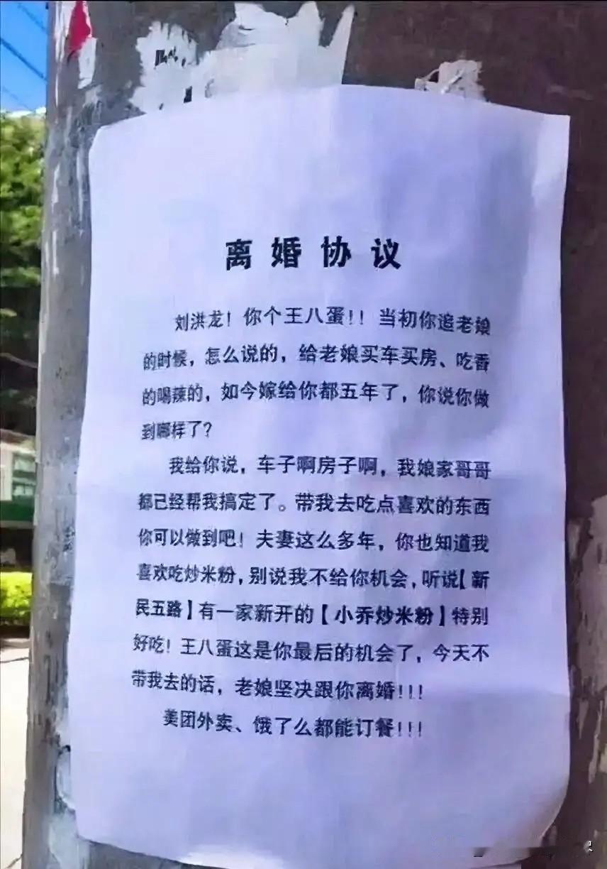 看了五遍才终于看明白 这贴在电线杆上的离婚协议 说的是一位叫刘洪龙的男子 五年前在娶老婆的时候 承诺给老婆买房买车 让老婆吃香的喝辣的 如今五年过去了 不仅他没能让老婆吃香的喝辣的 并且承诺给老婆买的房和车 也都是老婆的娘家哥哥帮忙买的 由于老婆喜欢吃炒米粉 于是他就在新民五路 新开了一家小乔炒粉店 店里的炒粉特别好吃 不知道大家都看懂了吗?