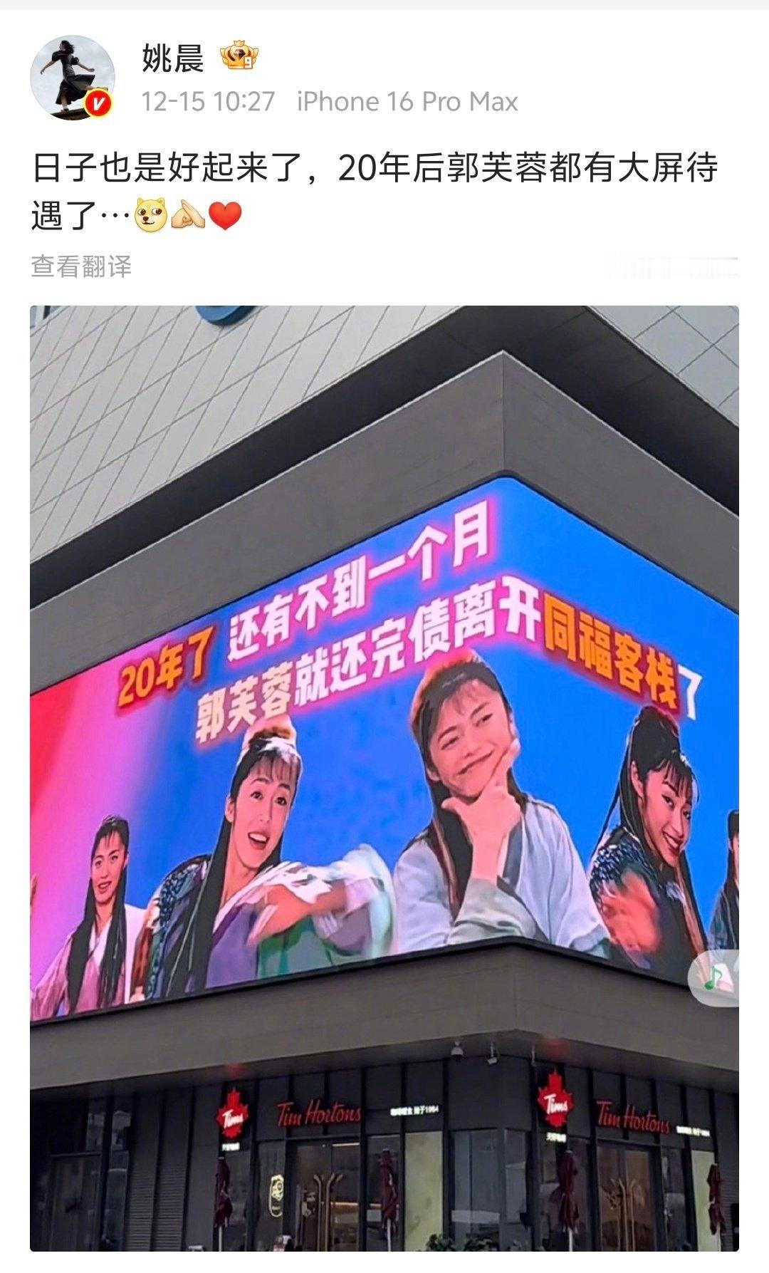 【姚晨回忆二十年前的今天】郭芙蓉都上大屏了 真的喜欢《武林外传》的各种周边故事!今天,演员今天晒出一张户外大屏照说,“日子也是好起来了,20年后郭芙蓉都有大屏待遇了…”她还回忆20年前的今天:“我应该是上午八点起床,去剧组食堂吃饭、喂山上的阿福、123、兔子们吃点馒头大棒骨啥的。从狗舍的小道拐进片场,跟迎面的每个人打招呼,再坐下化妆,看着镜子里的自己说:唉,又美了!”
