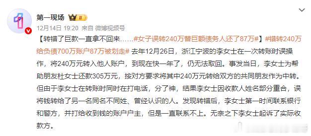 女子误转240万替巨额债务人还了87万 竟然一时半会要不回来了2024年12月26日,李女士帮朋友还款时,因通话分心仅输入收款人单名“莹”字,误转给两年前有过往来的乙女士(同名不同姓),分三笔转完240万,直到共同朋友甲女士反馈未收到钱,李女士才察觉错误,此时资金已进入乙女士账户收款方乙女士背景:她因拖欠徽商银行700万个人经营性贷款,账户早在2024年5月就被法院冻结保全,2025年2月,宁波市鄞州法院从该账户强制划扣87.4万元,用于清偿乙女士的其他债务李女士2025年2月的胜诉判决,仅确认乙女士需返还240万(债权关系成立),但这笔钱进入乙女士账户后,已成为其“责任财产”;而银行对乙女士的700万债权已先于李女士申请冻结(2024年5月),根据《民事诉讼法》,在先冻结的债权人优先受偿,李女士的债权属于“普通债权”,无法插队