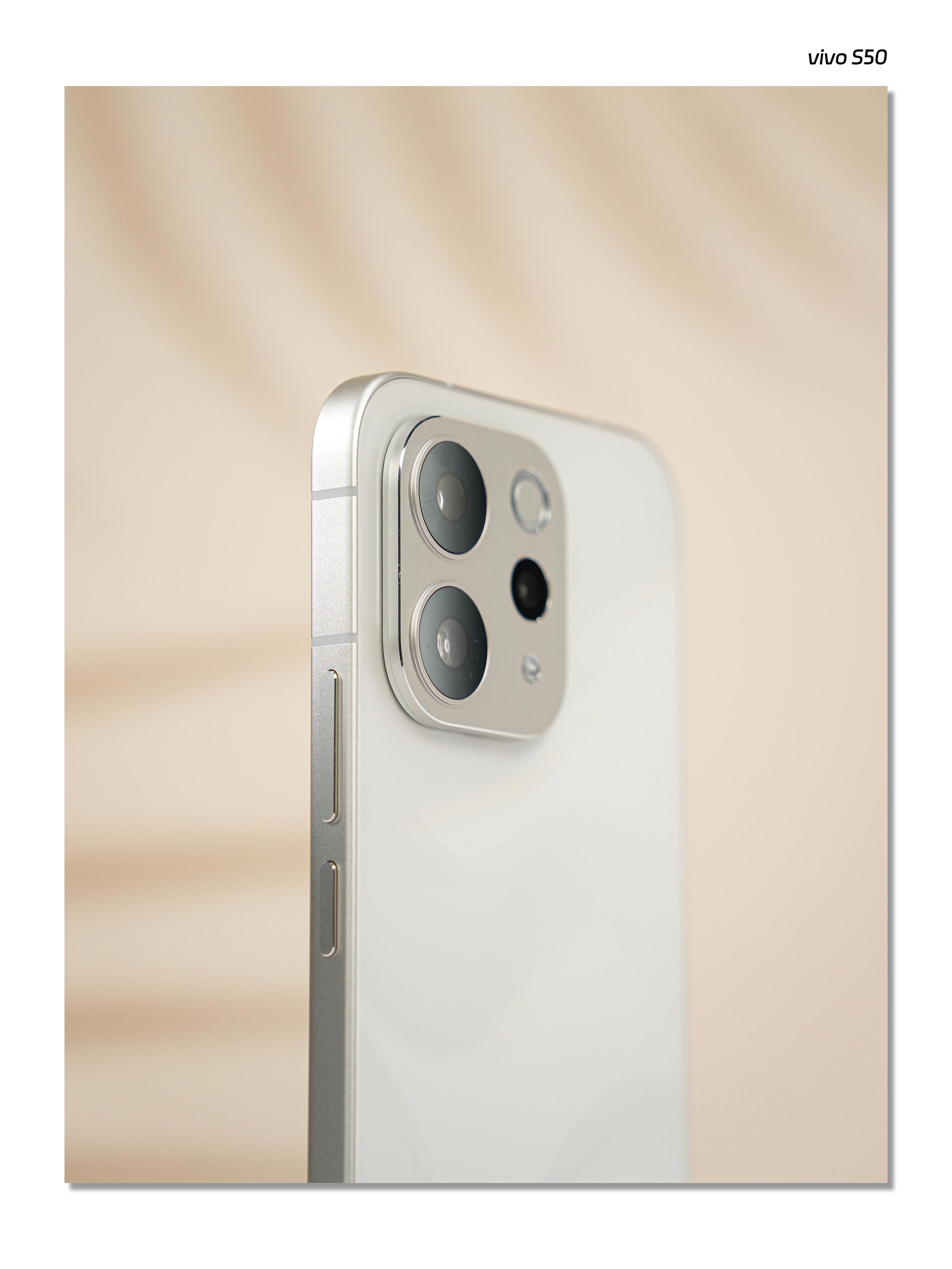 HYK图赏|vivo S50「告白」版本,整机是淡淡的暖白色调。背板采用纱缎光刻工艺,以低饱和度的珍珠白为主,搭配上浅蓝色与金色的渐变光带,光线照射下,不同角度背部的的光影、色彩都会有变化,多了一种层次感。镜头Deco用的是浮空岛设计,扁平化的航空铝金属镜头Deco从侧面看起来确实有种悬浮的感觉,搭配上航空铝金属中框,手感不错。vivo S50vivo S50 Pro mini