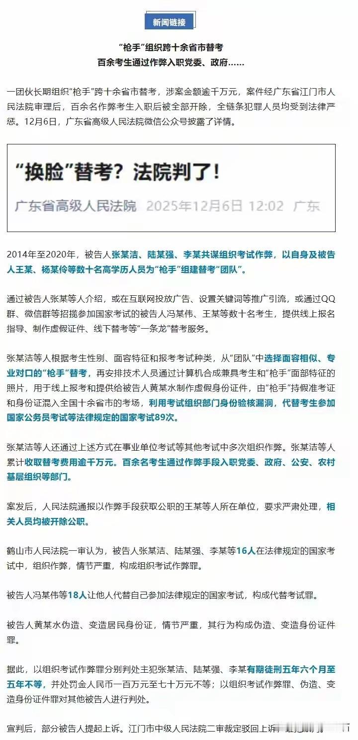 百余人公考作弊入职被开除,这事儿真让人惊掉下巴!2014 - 2020年,张某洁团伙搞出个“一条龙”替考服务。他们网罗高学历“枪手”,在互联网推广,还合成“融合脸”照片伪造证件。就利用考试组织部门身份验核漏洞,“枪手”持假证在十余省市替考89次,涉案超千万。 这些作弊考生入职党委、政府、公安等部门,部分都履职近5年。好在最后全链条34人定罪量刑,作弊入职者全被开除。公考本是公平选拔人才的渠道,这团伙严重破坏公平。只能说,投机取巧终会付出代价。