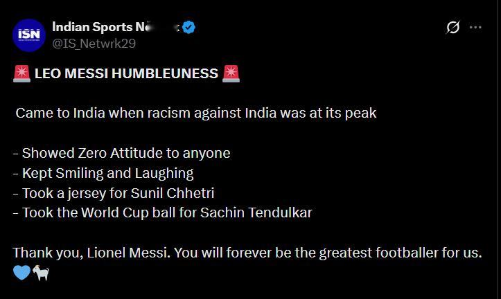 印度媒体盛赞梅西!🚨在针对印度的种族歧视最严重的时期,他来到了印度-对所有人都毫无架子-全程保持微笑-给苏尼尔·切特里赠送了一件球衣-给萨钦·滕杜尔卡尔赠送了世界杯用球感谢你,莱昂内尔·梅西。在我们心中你永远是史上最伟大的足球运动员。 💙 🐐 梅西印度行梅西
