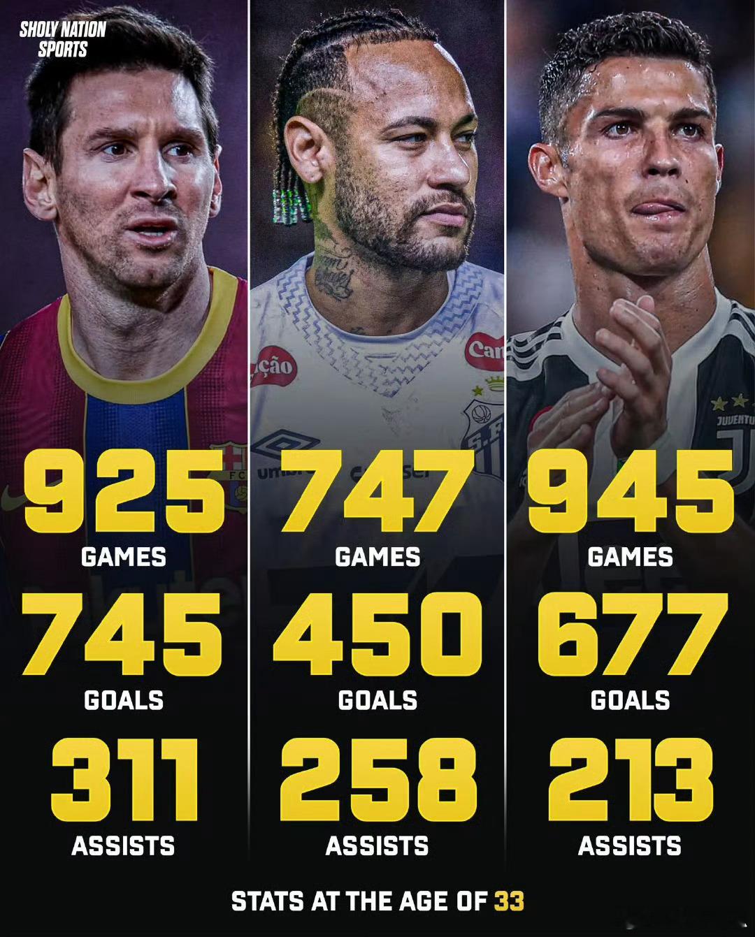 在33岁的年龄节点上,梅西、C罗、内马尔交出了如此恐怖的成绩单:梅西:745球