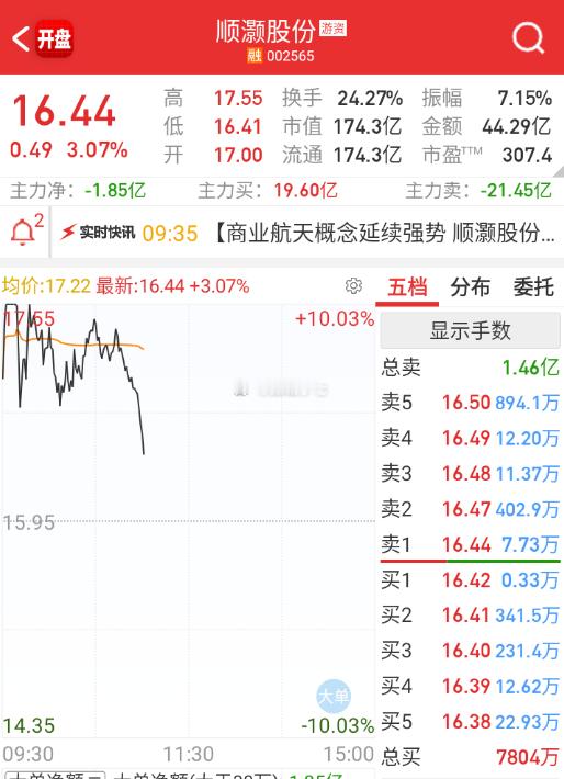 $顺灏股份 sz002565$ 这个已经坠机了,航天早盘分化就比较奇怪,看怎么收场。