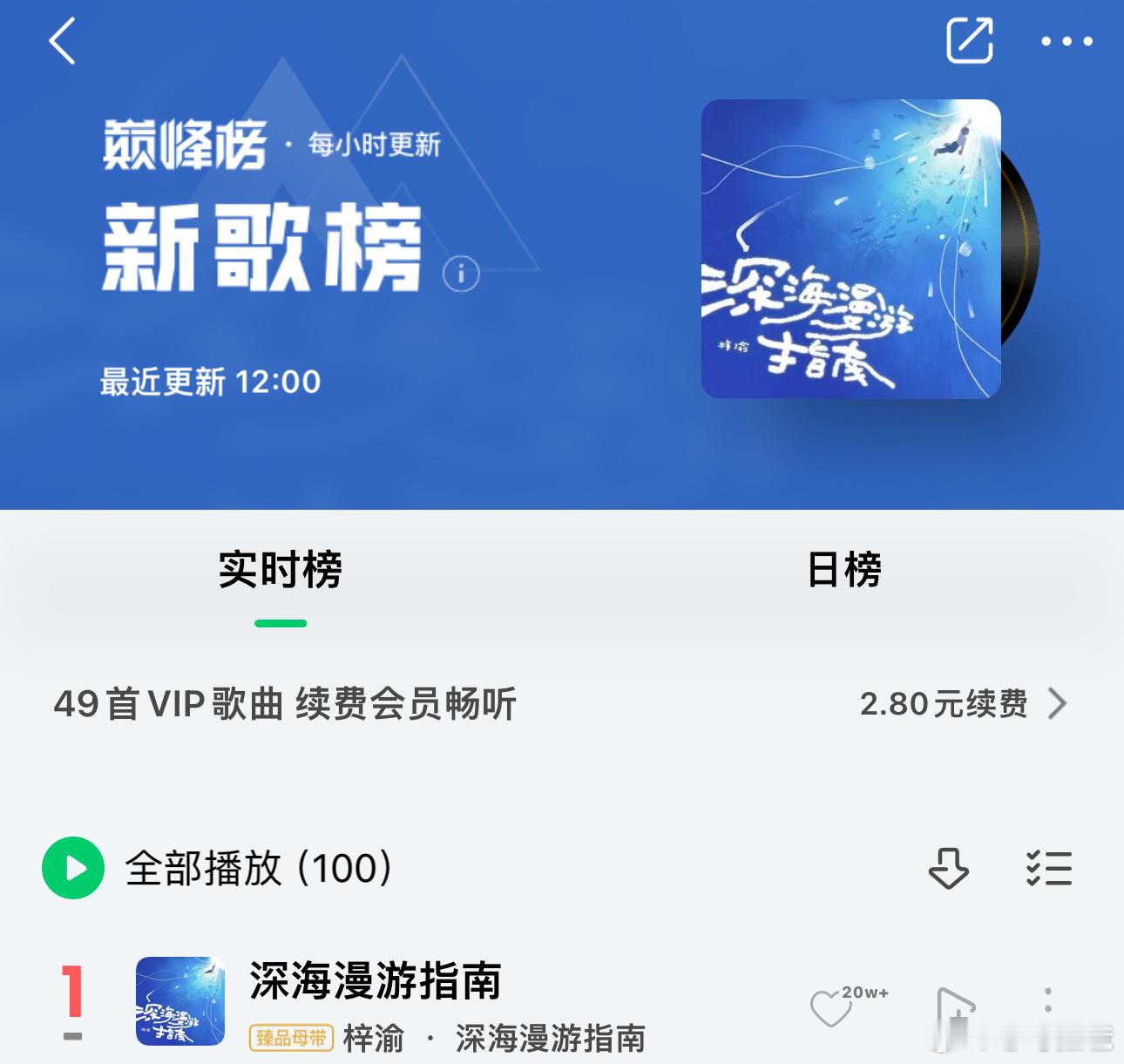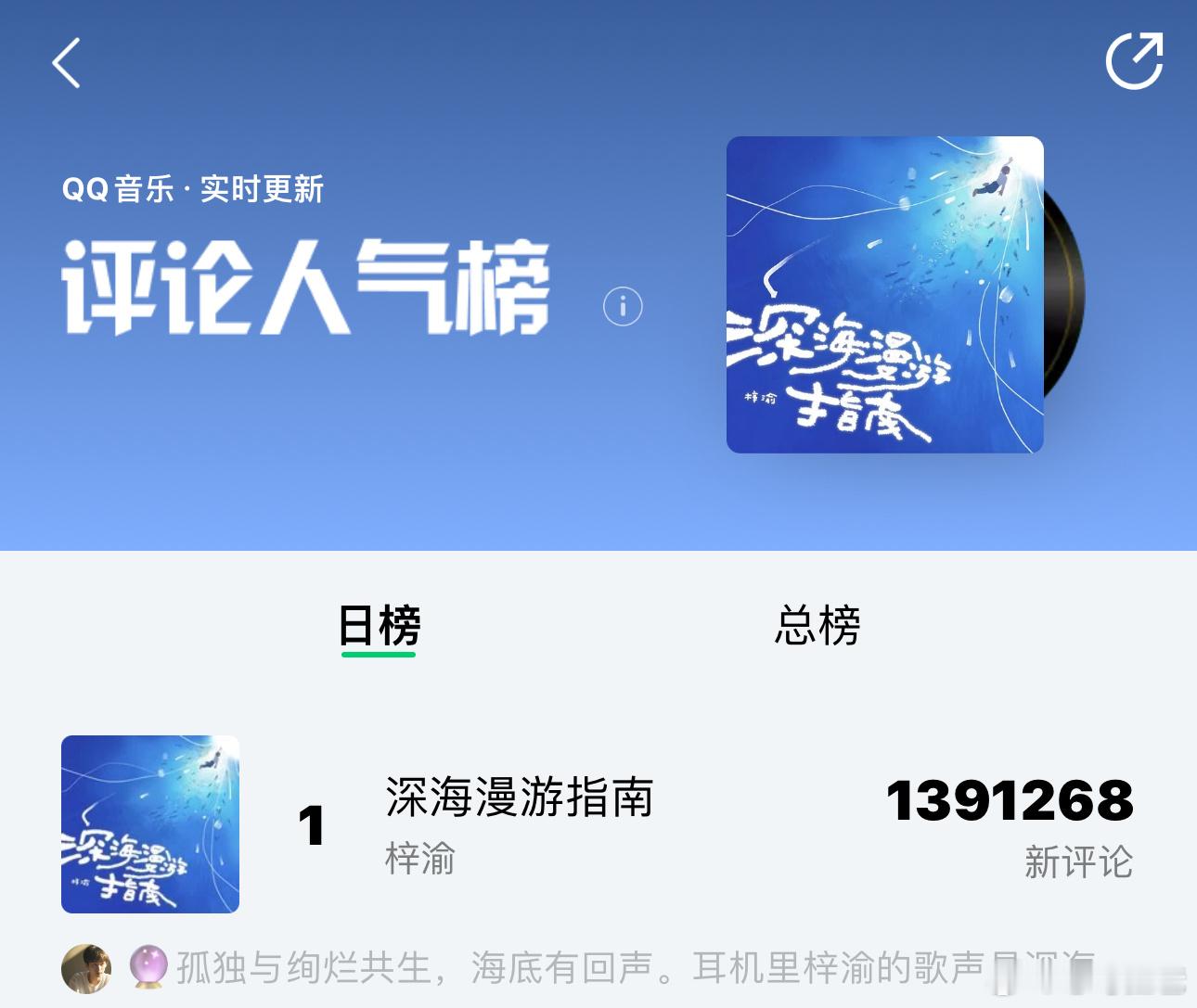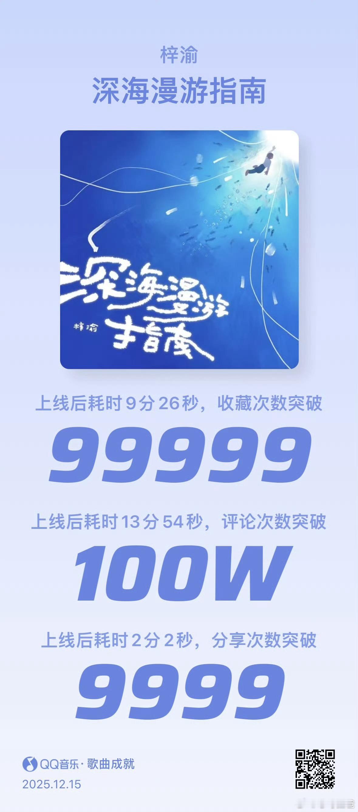 梓渝演唱会主题曲《深海漫游指南》上线后耗时9分26秒,收藏次数突破99999上线后耗时13分54秒,评论次数突破100W上线后耗时2分2秒,分享次数突破9999 现在Q音新歌榜、音乐指数榜、评论人气榜、巅峰潮流榜、腾讯由你榜均为🥇