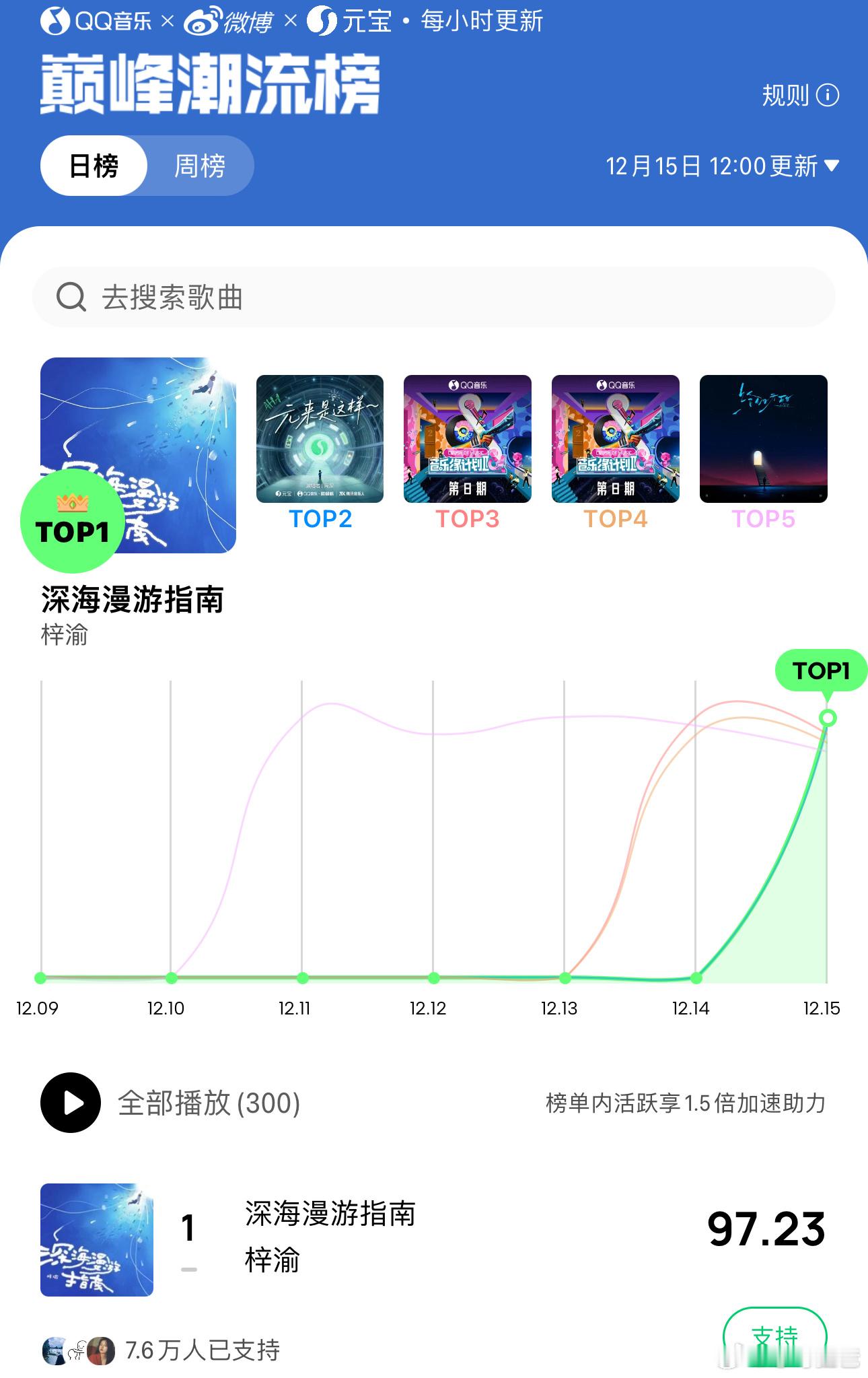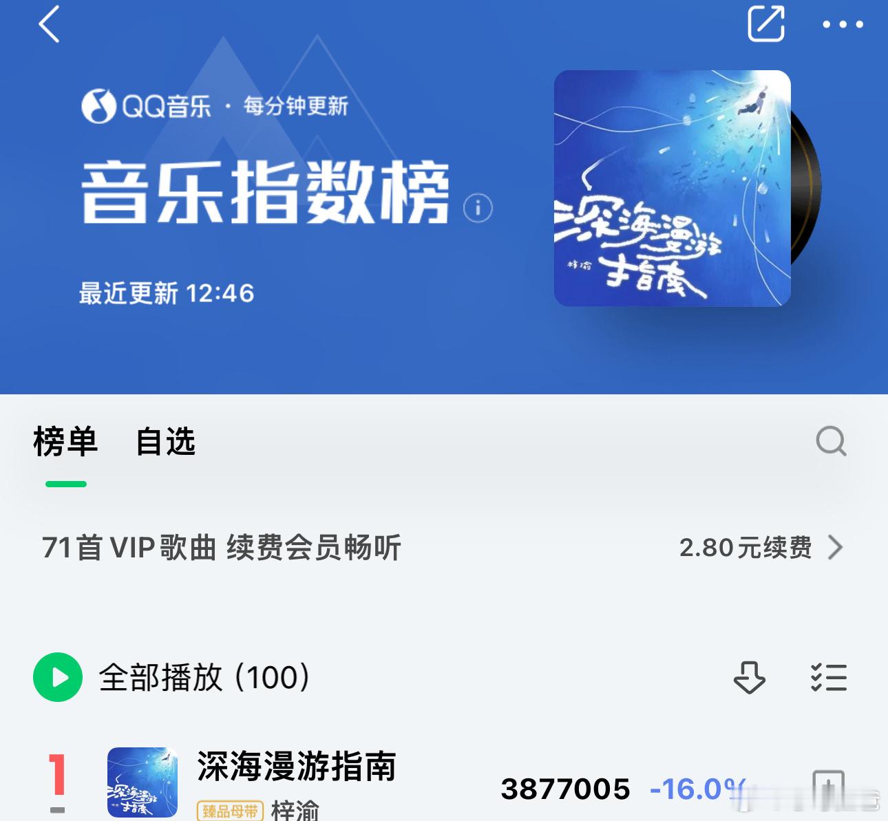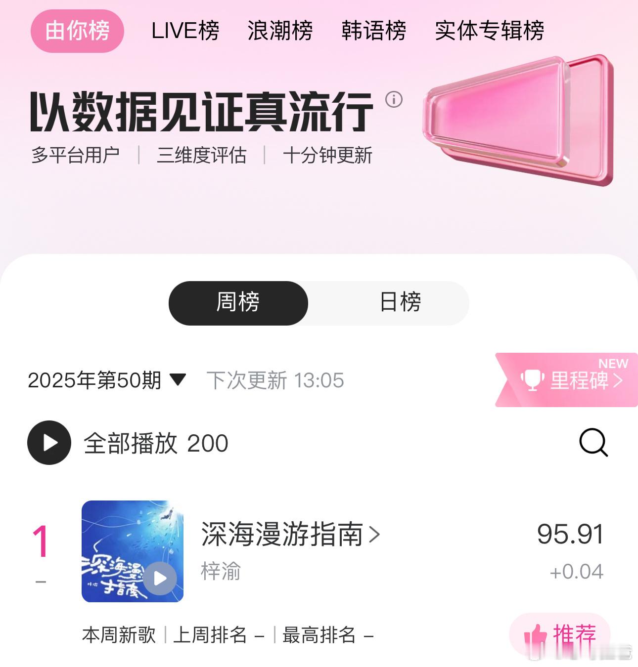 梓渝演唱会主题曲《深海漫游指南》上线后耗时9分26秒,收藏次数突破99999上线后耗时13分54秒,评论次数突破100W上线后耗时2分2秒,分享次数突破9999 现在Q音新歌榜、音乐指数榜、评论人气榜、巅峰潮流榜、腾讯由你榜均为🥇