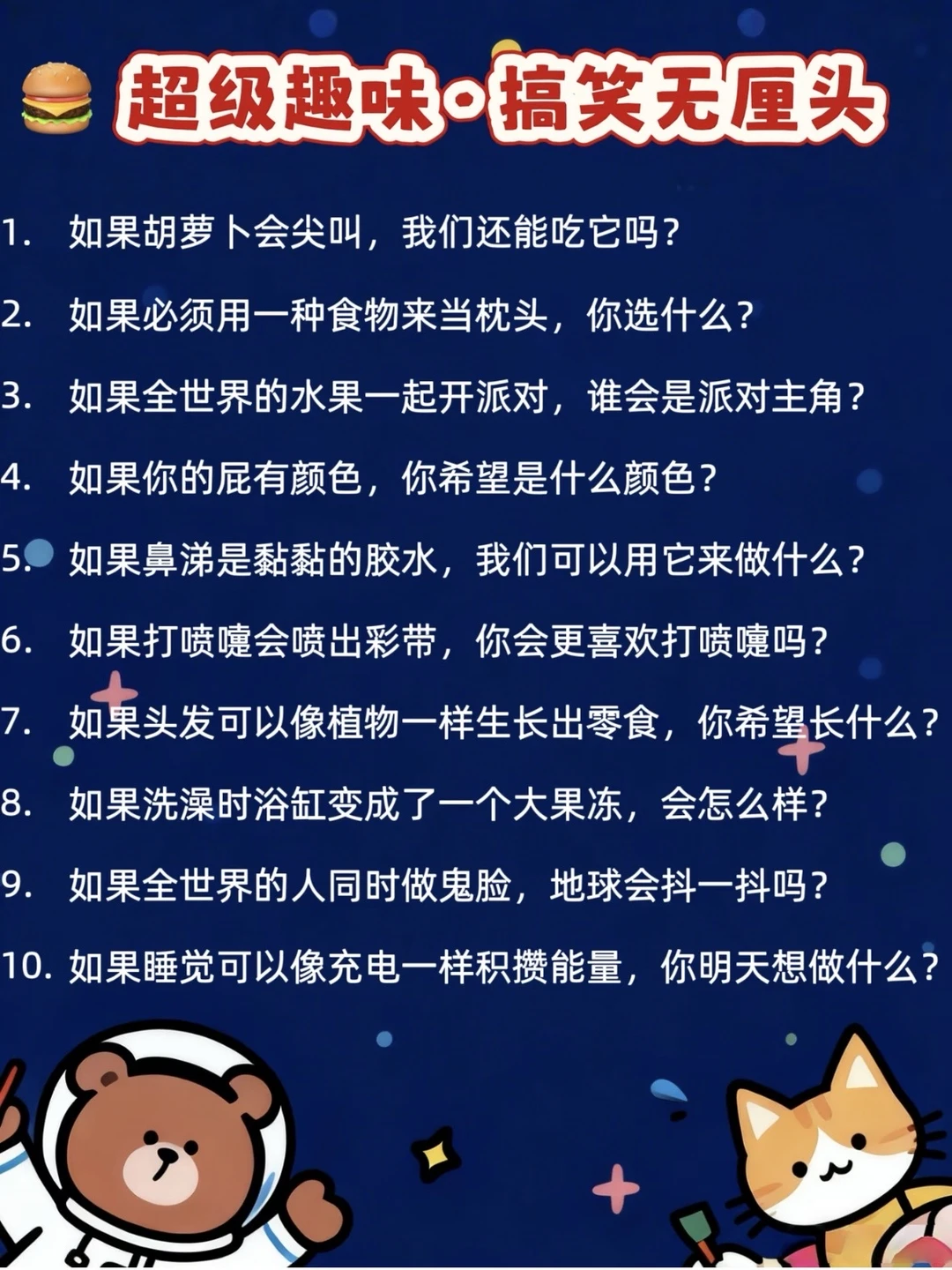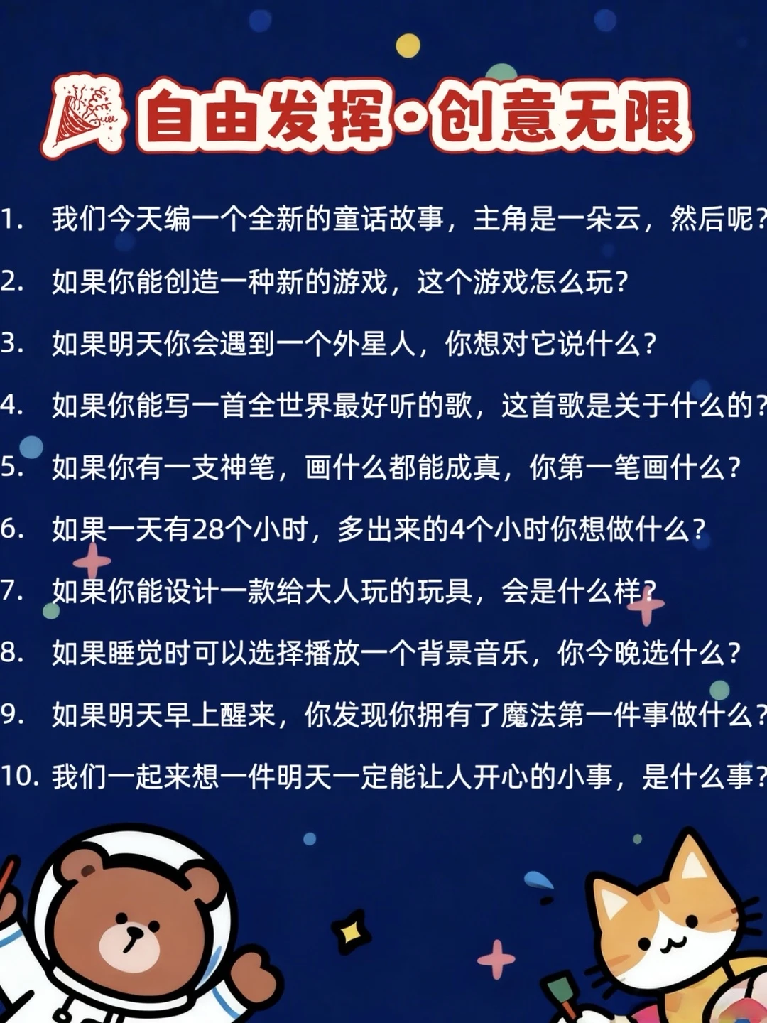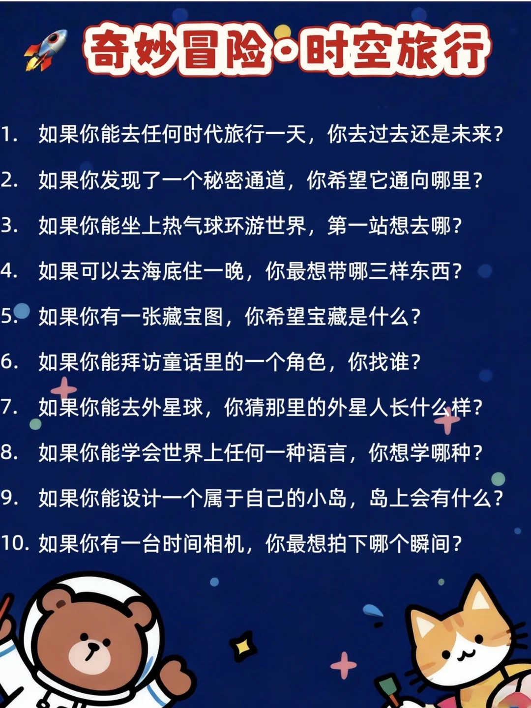 不知道各位爸妈有没有同感,孩子一旦变成“小话痨”之后,那些日常的“吃饭了吗”“今天学了什么”之类的问答,他们常常爱答不理。其实呀,他们的小脑袋里更爱琢磨那些天马行空、稀奇古怪的问题,那些充满奇思妙想的话题才能真正点燃他们的表达欲! 我特意整理了100个特别适合小朋友的奇趣话题,用词简单,却充满趣味和讨论空间~试着跟娃聊了几个,他一下子就打开了话匣子,讲得头头是道,特别投入!这些话题不仅能激发孩子的想象力,还能让我们悄悄走进他们的小世界~各位家长,赶紧收藏用起来吧!