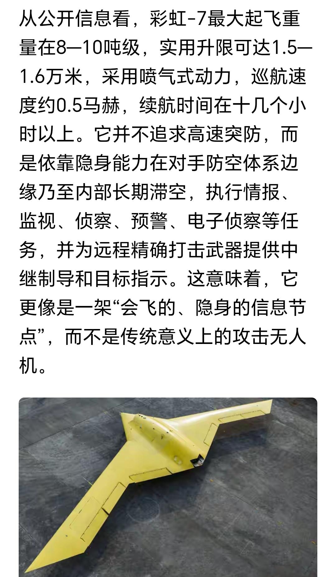 洋气!彩虹🌈-7无人机首飞了。 高空:1.5-1.6万米。 高速:0.5马赫。 长航时:16个小时。 高载重:载重8-10吨。 用来干啥的? 彩虹,当然是架桥的咯。 架起一道战场信息感知的立交桥。是空中隐身的千里眼顺风耳心意通。 上次印巴57空战,小小地展示了一下体系作战的威力,还没有把这些东西拿出来,就已经所向无敌了。 这才叫高深莫测啊。 什么?你说美械RQ-170啊? 4.5吨载荷,6小时巡航。 真不是瞧不起它,这点数据能看?[抠鼻] 点右上角关注我,我们一起去看这个魔幻的世界