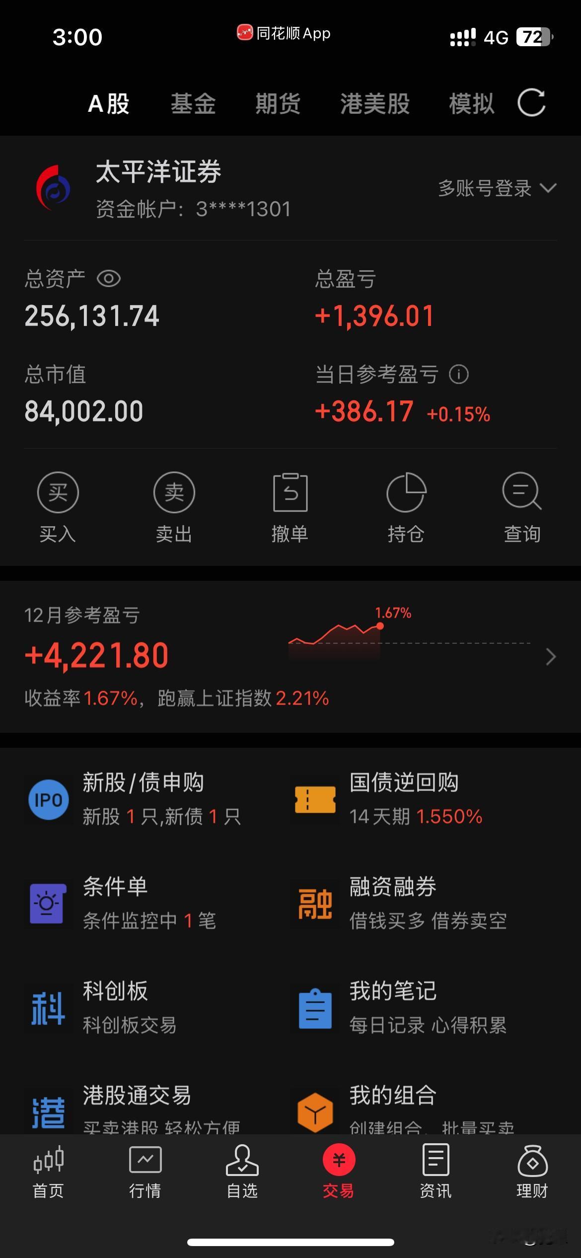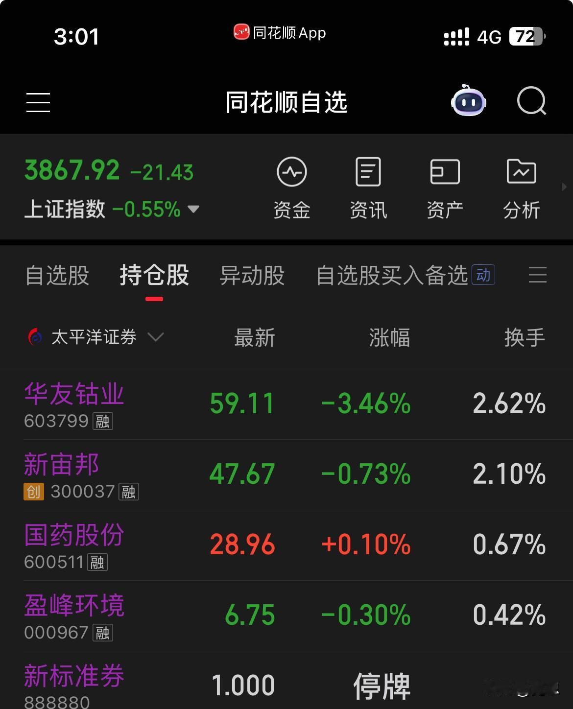 下午大盘一波更比一波低。个股一片狼藉,个股分化严重。尾盘我把金盘卖了,今天逆势上涨,担心明天补跌。其他没动。上午抄在半山腰的华友和宙邦下午基本横盘,没怎么再跌,盈峰依然我行我素,走势特立独行。收盘账户红了4百不到。希望明天大盘能够反弹。如果明天上午再下跌就是加仓低吸的机会。