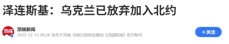 早知今日,泽连斯基何必当初!2025年12月14日,乌克兰总统泽连斯基:乌克兰已放弃加入北约,以此换取西方的安全保障,作为结束俄乌冲突的妥协方案! 有人认为第三次世界大战已经爆发,而开端就是俄乌冲突。2022年的时候,因为北约东扩以及顿巴斯冲突,普京对乌克兰展开了军事行动,俄乌冲突正式爆发。而在之后三年多的时间,俄乌冲突始终没有停火。 在这将近四年的时间里,俄乌冲突有多次机会迎来停火协议。但是因种种因素的影响,始终没有达成停火协议。 而就在近期,俄乌冲突终于迎来了大结局的趋势。但是想要彻底的结束俄乌冲突,就有一个敏感的话题,那就是乌克兰加入北约。 冲突爆发的一个因素就是因为乌克兰要加入北约,北约东扩之后会对俄罗斯形成安全威胁。所以俄罗斯才会针对乌克兰发动军事行动,那么俄罗斯自然是绝对不会同意,让乌克兰加入北约。 而这就是三年多的时间里,俄乌冲突始终没有达成停火的主要原因之一。就在近期伴随着多个国家介入以及美国不断的施压下,乌克兰总统泽连斯基终于改变了想法。 2025年12月14日的时候,泽连斯基在柏林会晤美国特使前夕的时候表示。乌克兰已放弃加入北约的目的,以此去换取西方的安全保障,作为结束俄乌冲突的妥协方案。 泽连斯基的这一表态迅速引起了极大的讨论,对此只想说早知今日,何必当初。在这三年多的时间,乌克兰的人力等多方面受到了重损。最终换来的结局,却还是放弃。 对此,您怎么看? (信息来源:泽连斯基:乌克兰已放弃加入北约-顶端新闻)