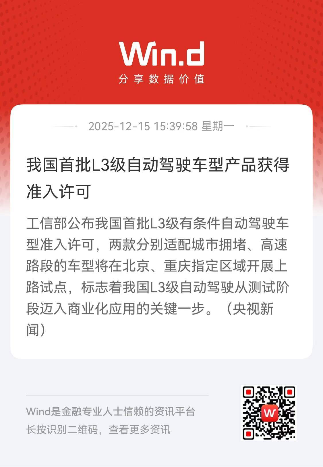 L3 会先在重庆和北京上。——目前有两款具备L3功能的车型,可以生产、销售给消费者。——而且购买了这款车的车主,在规定的区域(北京、重庆的指定路段)和规定条件下使用L3功能(比如高速场景)