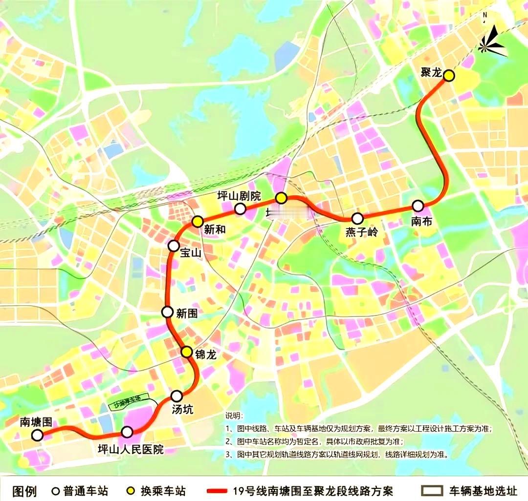 深圳地铁19号线 深圳地铁19号线一期工程西起南塘围站,途经龙岗区、坪山区,东至聚龙站,线路大致呈东西走向。一期工程全长14.487千米,全部为地下线;共设置12座车站,其中换乘站4座,全部为地下车站。 19号线一期工程串联了坪山中心区、高新园区、碧岭等片区,并规划与14号线、16号线、深大城际等多条线路换乘,将显著提升坪山区的轨道交通服务水平。目前,线路已全面进入主体施工阶段,部分车站如锦龙站、宝山站已完成围护结构施工。 想象一下,以后从龙岗去坪山,坐着19号线,一路顺畅,省时又省力。这地铁开通后,肯定能大大提升这两个区的交通便利性,促进区域发展,不管是上班通勤还是出门游玩,都能更轻松啦。 深圳地铁 地铁19号线 19号线沿线 19号线北延 轨交19号线