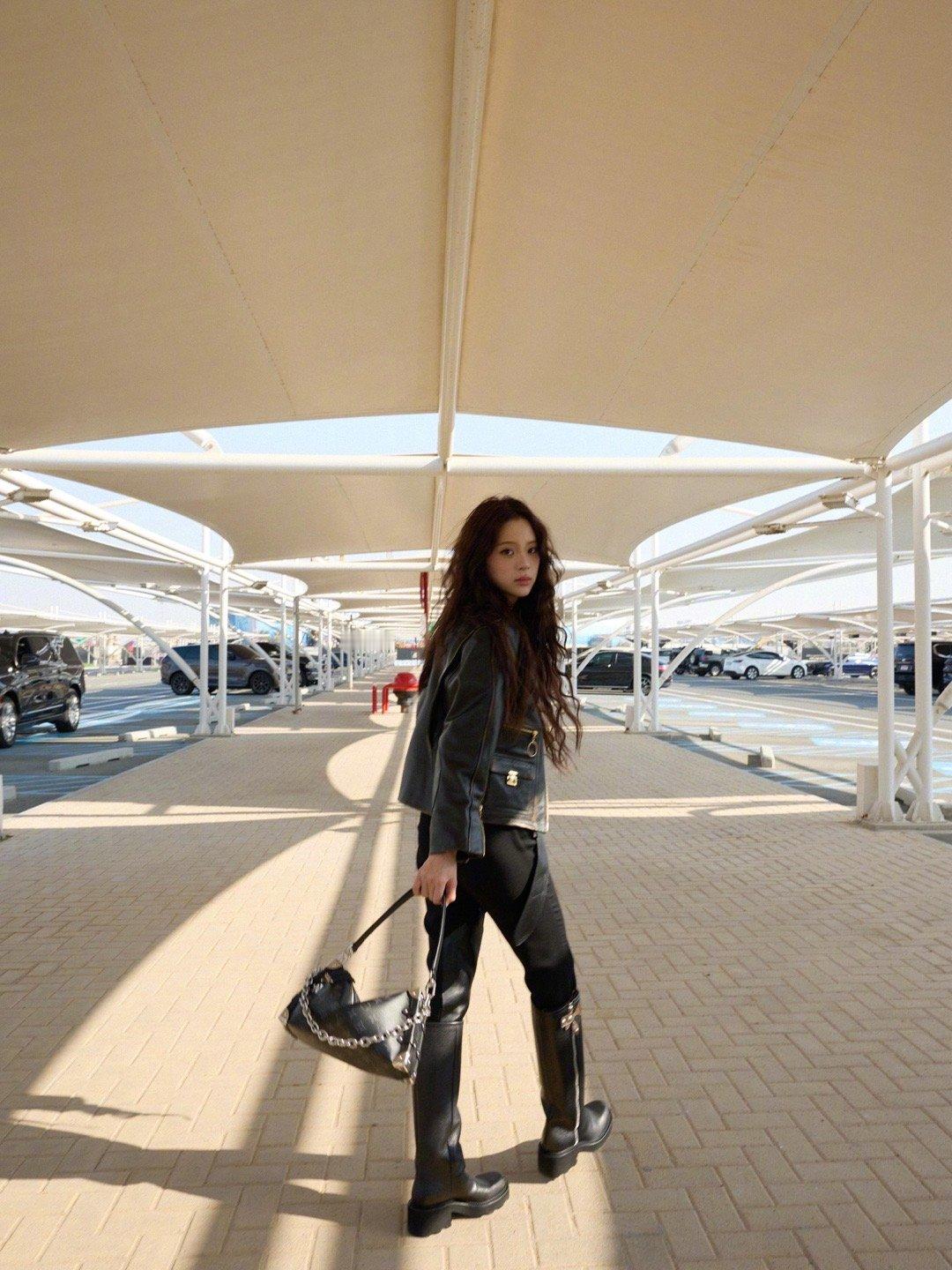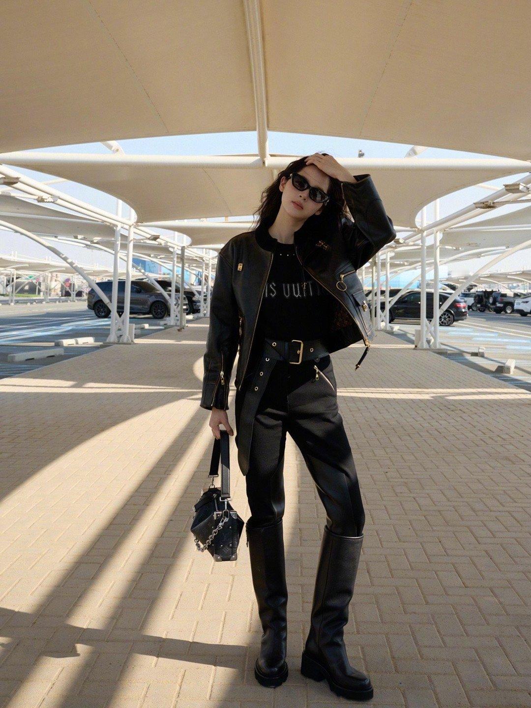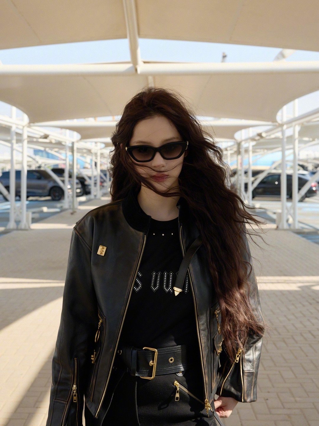 欧阳娜娜机车造型青春时髦欧阳娜娜亮相阿布扎比观看F1决赛,很酷的机车女孩造型,黑色皮质短外套搭配简约内搭,利落中透着不羁气息,下身选择率性长裤与厚底靴,既有少女的灵动,又融入了机车元素的飒爽,把LV穿的青春又时髦!