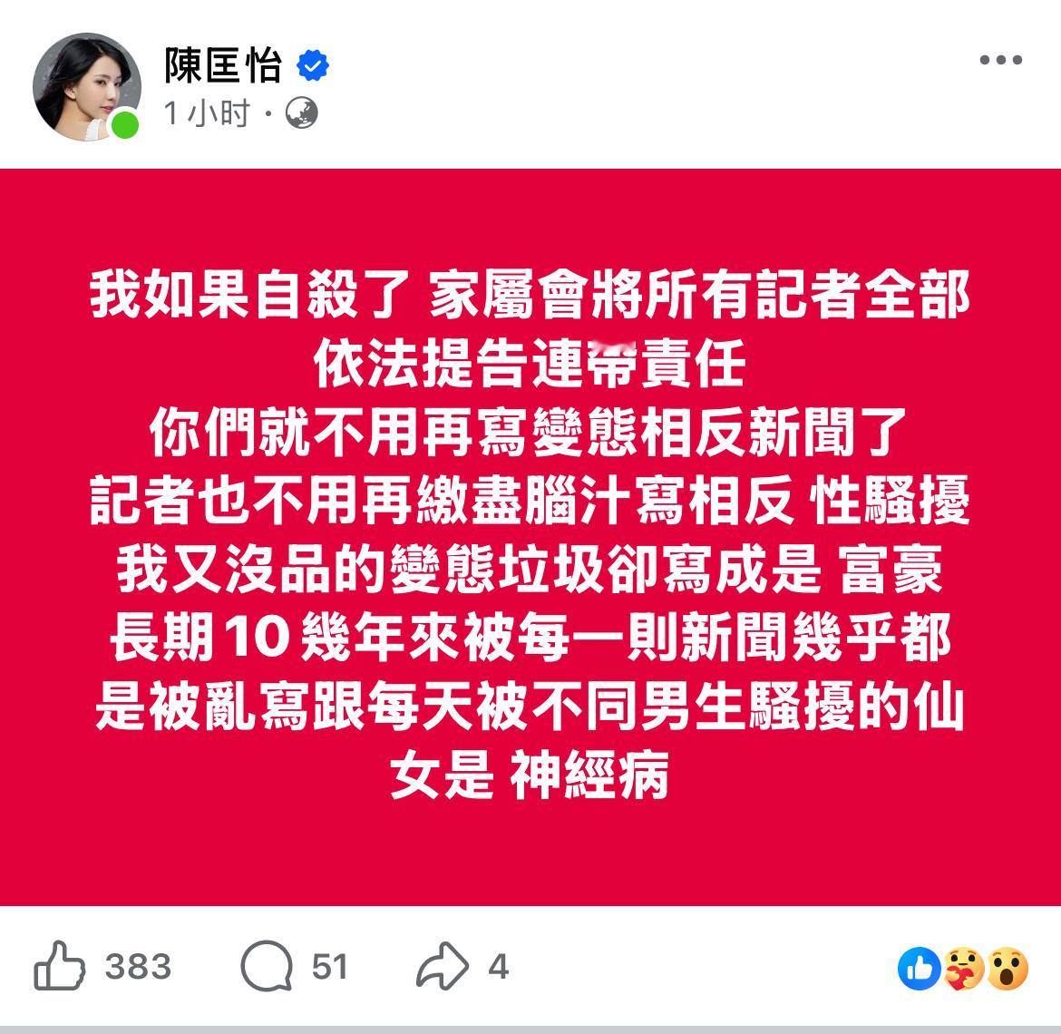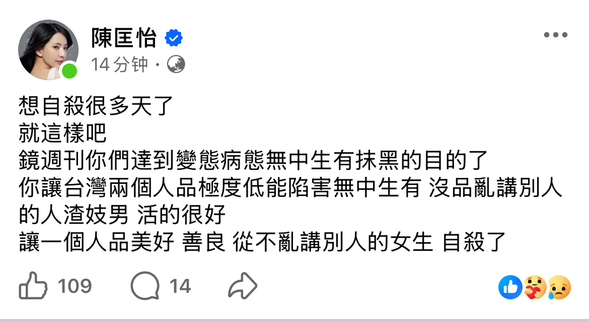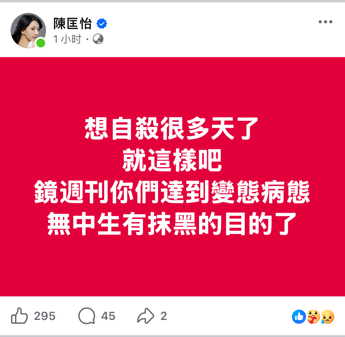 陈匡怡十几分钟前发布社媒称“想自杀很多天了”,截至目前发了六条消极博文。陈匡怡演过《我可能不会爱你》的Maggie,这两年台媒经常跟拍她独自出门形单影只,还爆料她的绯闻,陈匡怡为了自证在脸书上经常回应。陈匡怡让记者不要再乱写感情坎坷 陈匡怡发文想轻生