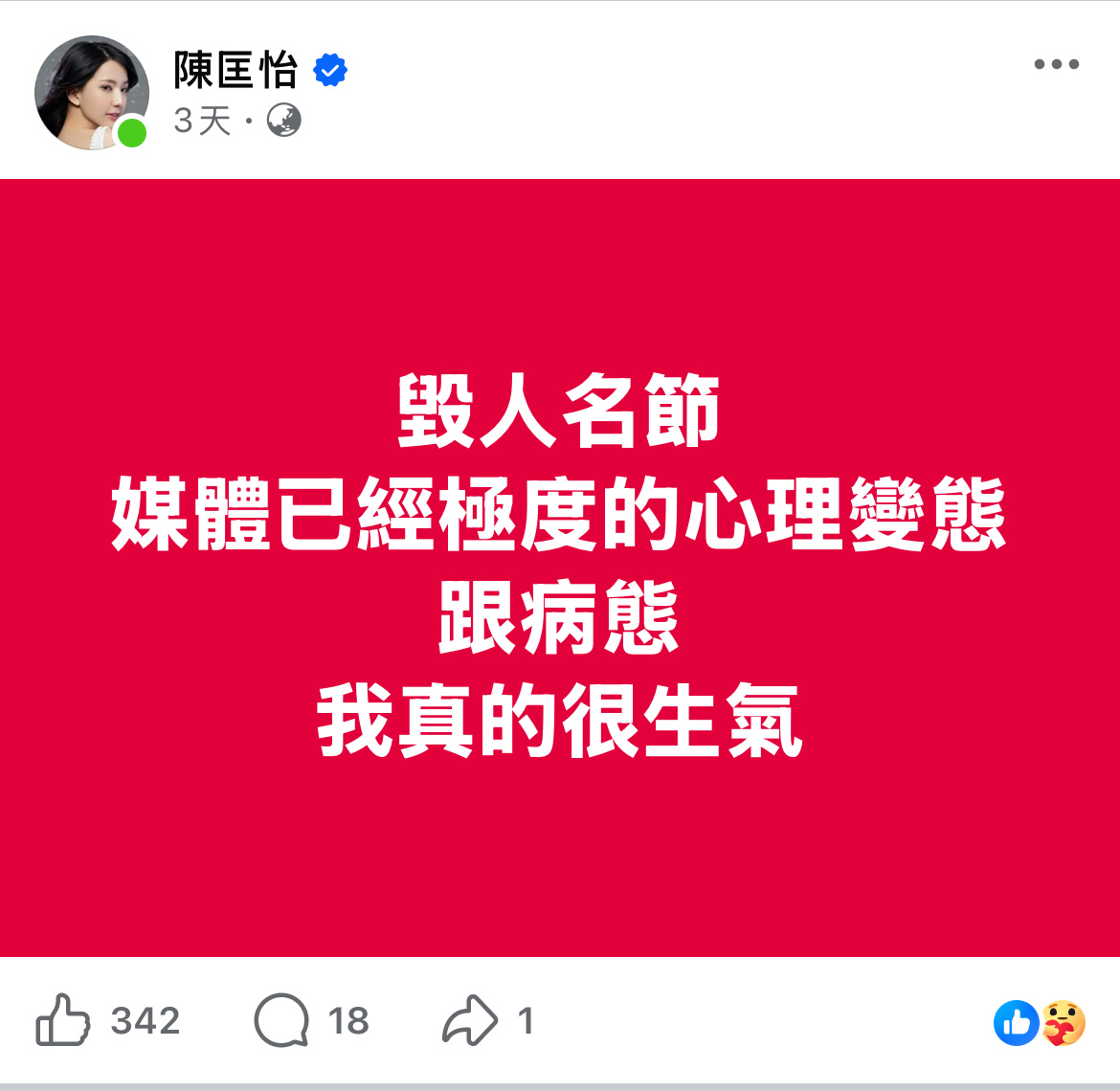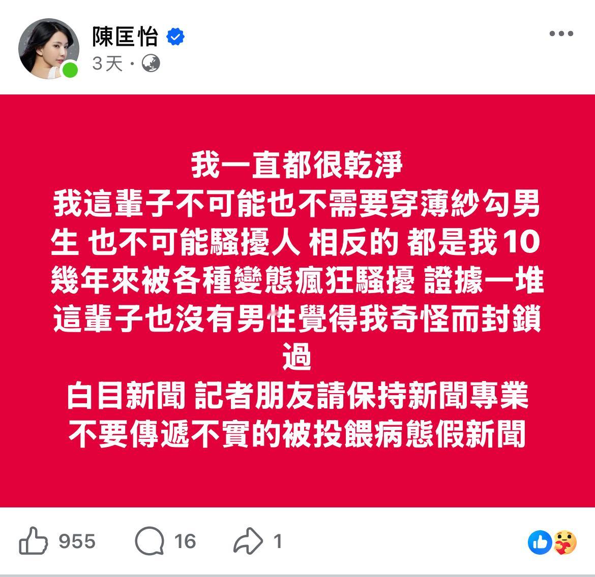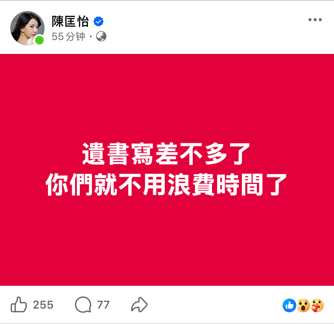 陈匡怡十几分钟前发布社媒称“想自杀很多天了”,截至目前发了六条消极博文。陈匡怡演过《我可能不会爱你》的Maggie,这两年台媒经常跟拍她独自出门形单影只,还爆料她的绯闻,陈匡怡为了自证在脸书上经常回应。陈匡怡让记者不要再乱写感情坎坷 陈匡怡发文想轻生