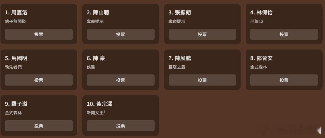 万千星辉颁奖典礼2025丨最佳主角最后十强.1. 周嘉洛,痞子無間道2. 陳山聰,奪命提示3. 張振朗,奪命提示4. 林保怡,刑偵125. 馬國明,執法者們6. 陳 豪,俠醫7. 陳展鵬,巨塔之后8. 郭晉安,金式森林9. 羅子溢,金式森林10. 黃宗澤,新聞女王²TVB