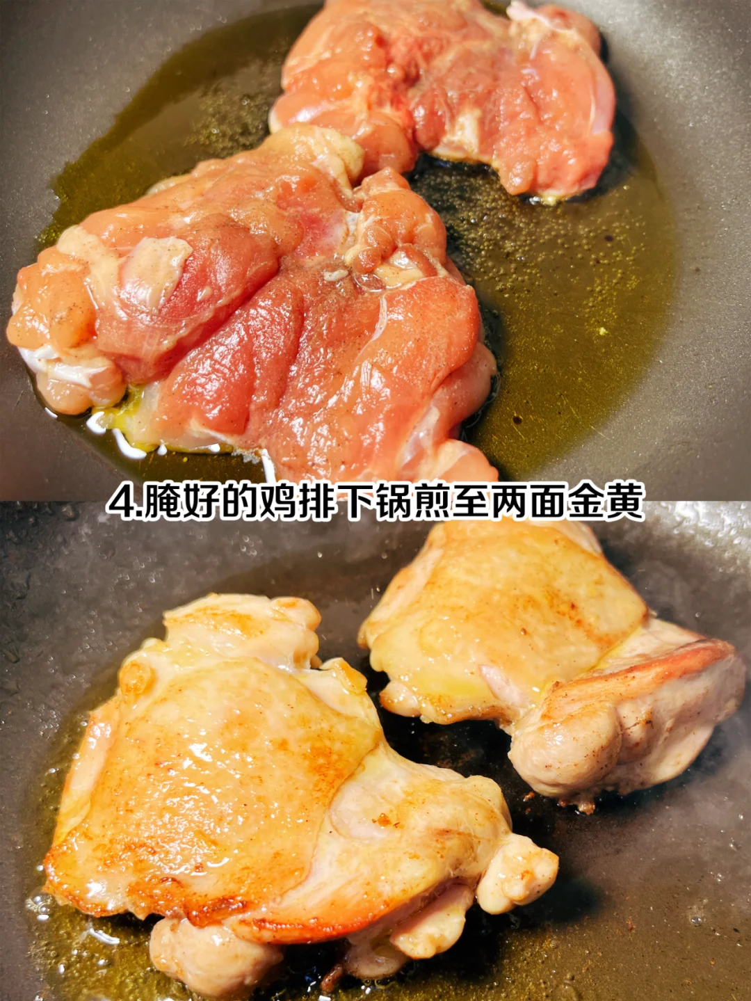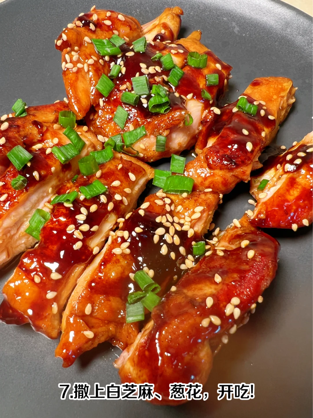 家常快手菜 分享,鲜嫩多汁的【照烧鸡排】,既好看又好吃[赞R][赞R][赞R] [派对R]步骤: 1.鸡腿肉去骨,肉身上切一下更好入味 2.加胡椒粉、盐,抓拌均匀腌制十分钟 3.调照烧汁:两勺生抽、1勺老抽、一勺蚝油、少许白糖、1勺蜂蜜,一碗清水搅拌均匀 4.腌好的鸡排下锅煎至两面金黄 5.倒入照烧汁,开锅后煮十分钟,收汁后就可以出锅了 6.改刀切小块装盘,淋上锅内剩余酱汁 7.撒上白芝麻、葱花,开吃[飞吻R]