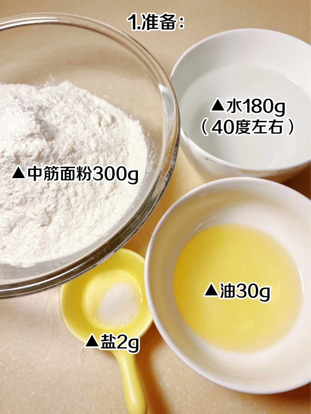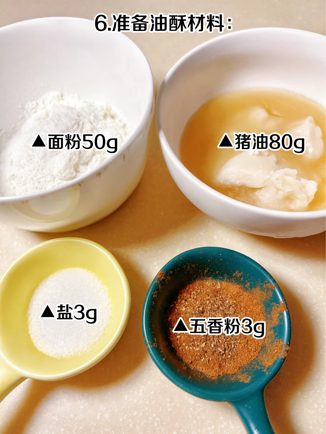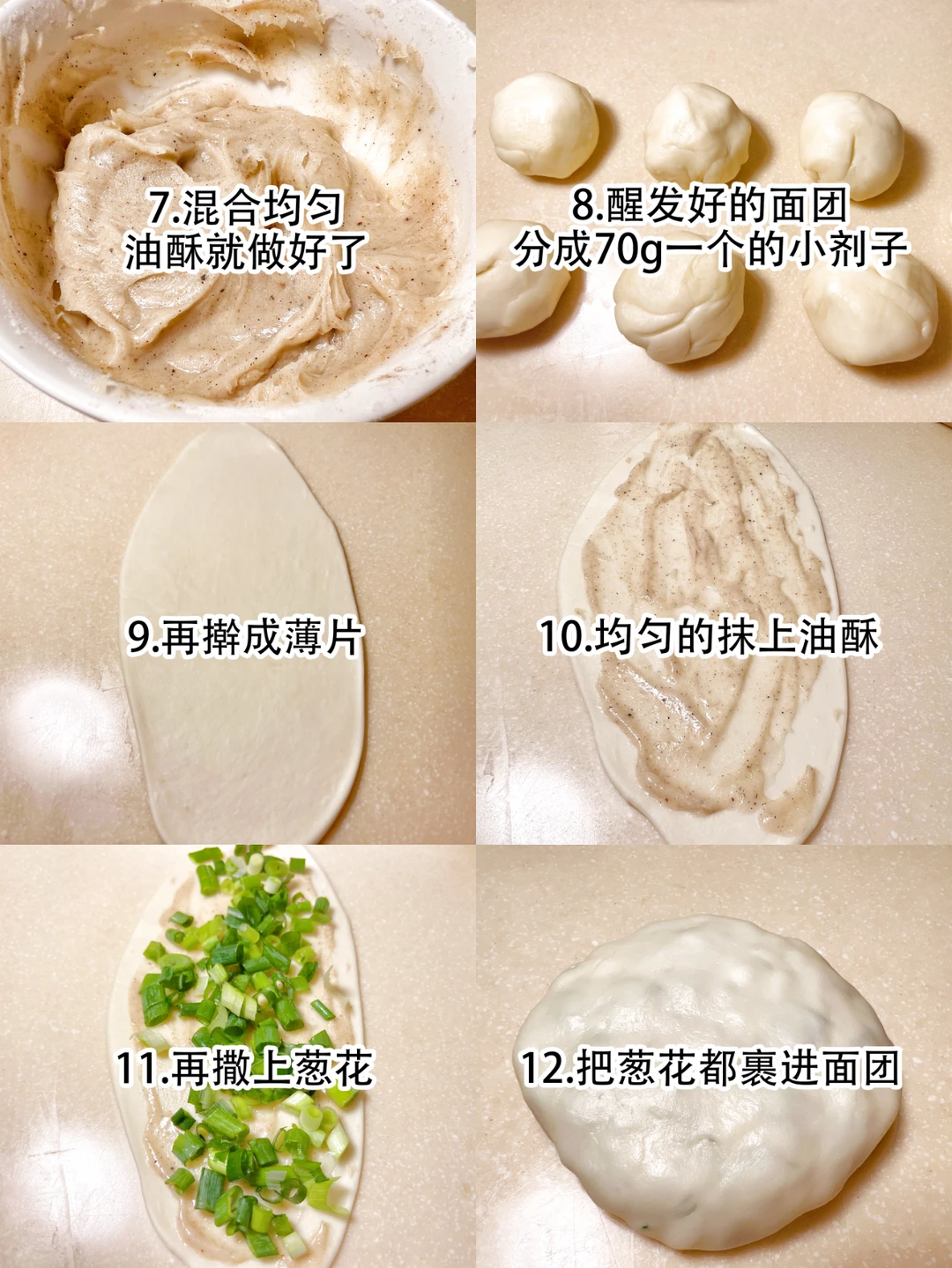 花样面食  葱油饼 再也不用去上海排长队买葱油饼啦,在家自己做起来[得意R] [派对R]步骤: 1、准备中筋面粉300g、水180g(40度左右)、盐2g、油30g 2、水慢慢加进去,搅成大面絮后再揉 3、揉成光滑柔软的面团 4、抹上油稍微醒发一会 5、小葱切成葱花备用 6、准备油酥材料:猪油80g、面粉50g、盐3g、五香粉3g 7、混合均匀,油酥就做好了 8、醒发好的面团分成70g一个的小剂子 9、再擀成薄片 10、均匀的抹上油酥 11、再撒上葱花 12、把葱花都裹进面团 13、饼胚压圆,锅内放油,中火煎至两面上色 14、烤箱230度再烤5分钟,烤过的葱油饼更加的酥脆哦~